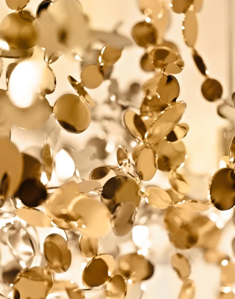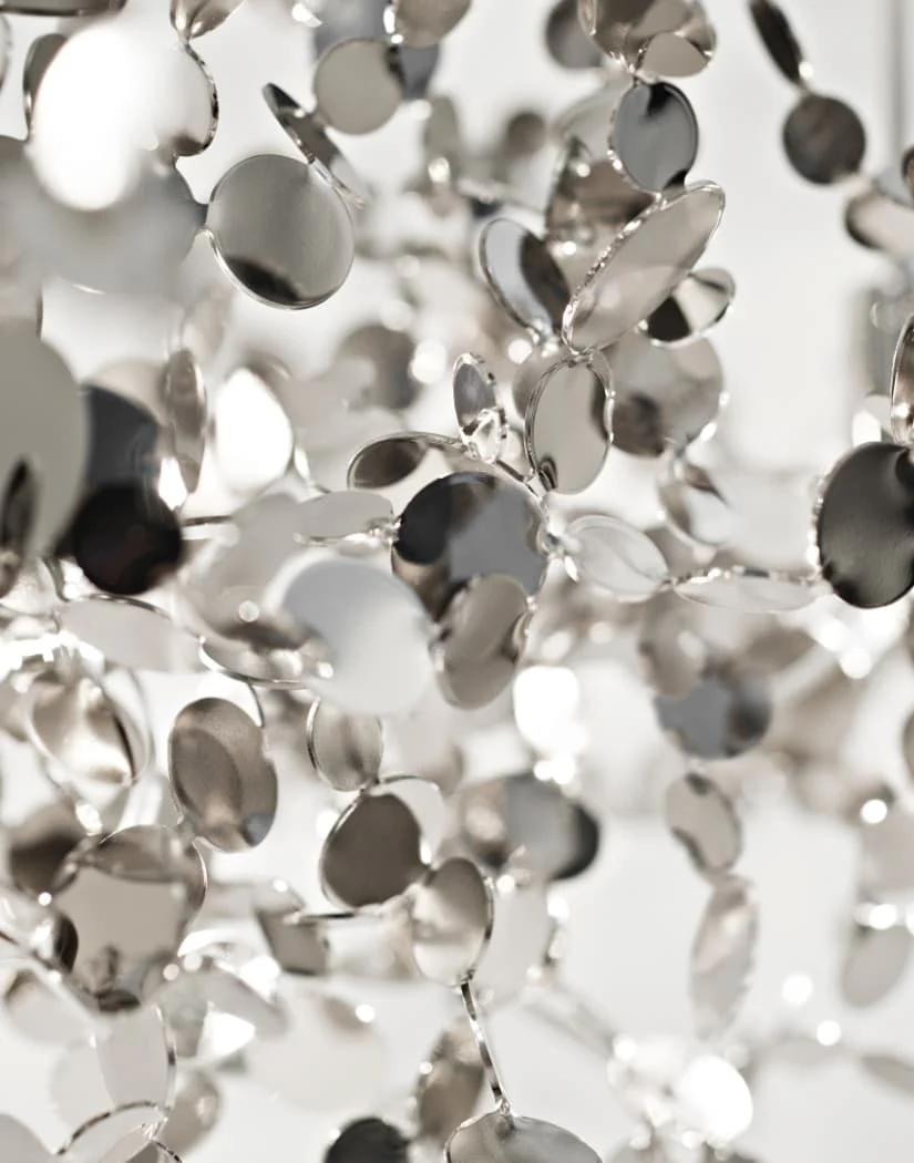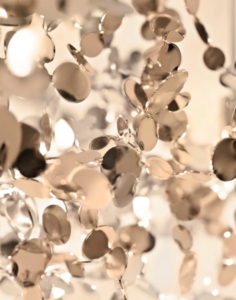 Konstrukcja lampy opiera się na ręcznie formowanych metalowych dyskach, które zostały starannie ukształtowane przez rzemieślników Terzani w efektowne, przestrzenne skupiska. Po włączeniu światła, liczne fazowane powierzchnie dysków odbijają i rozpraszają promienie, emitując delikatny, migoczący blask.