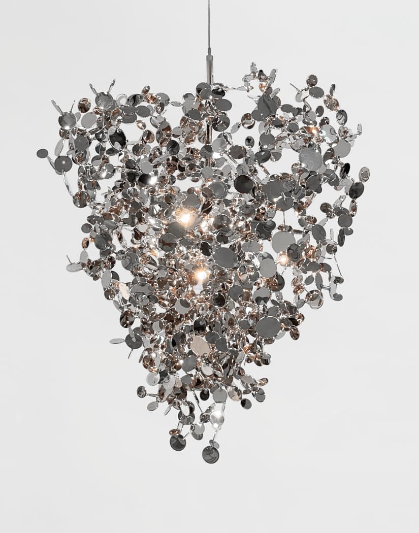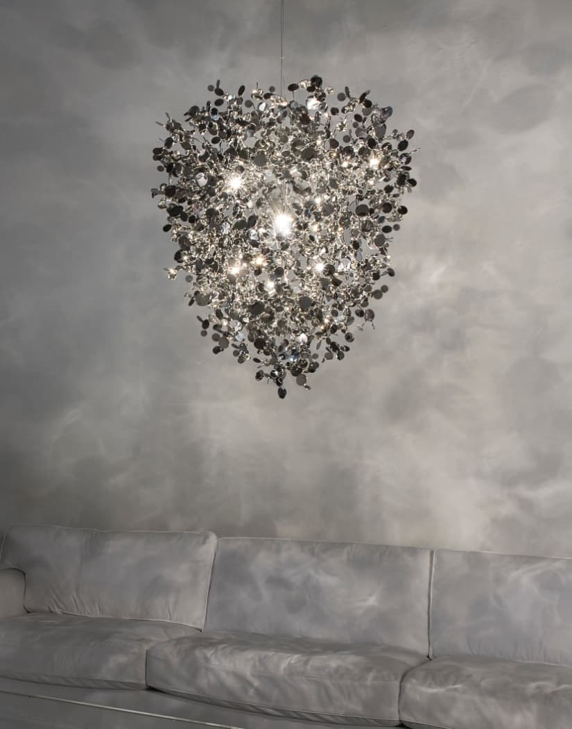 Konstrukcja lampy opiera się na ręcznie formowanych metalowych dyskach, które zostały starannie ukształtowane przez rzemieślników Terzani w efektowne, przestrzenne skupiska. Po włączeniu światła, liczne fazowane powierzchnie dysków odbijają i rozpraszają promienie, emitując delikatny, migoczący blask.