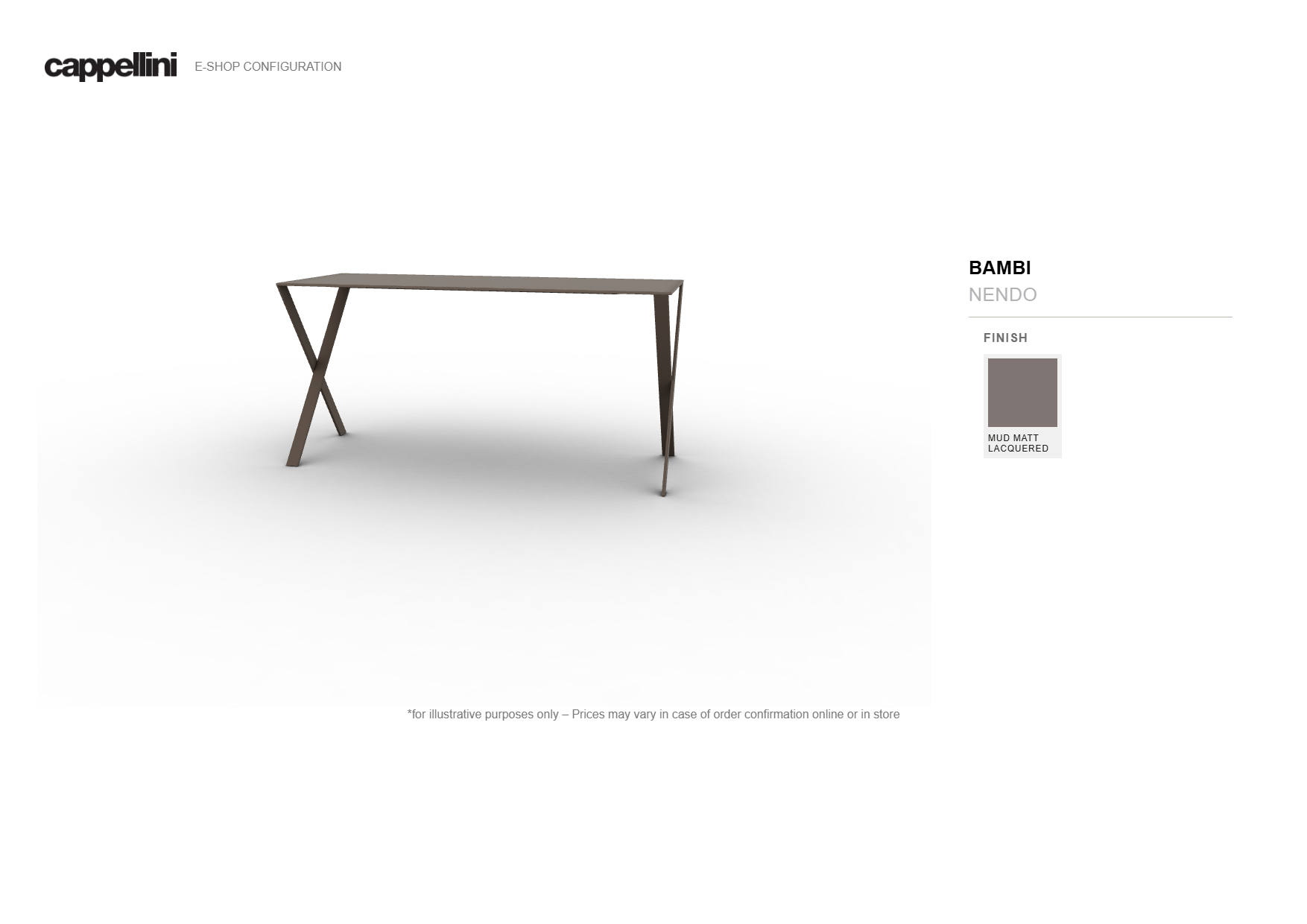 Blat stołu wykonany jest z giętej, laserowo ciętej płyty aluminiowej, co nadaje mu lekkości i subtelnej elegancji. Konstrukcję wspierają nogi i podstawa z metalu wytłaczanego, gwarantujące stabilność oraz trwałość. Całość pokryta jest całkowicie matowym lakierem w trzech kolorach: białym, czarnym oraz błotnistym (mud).