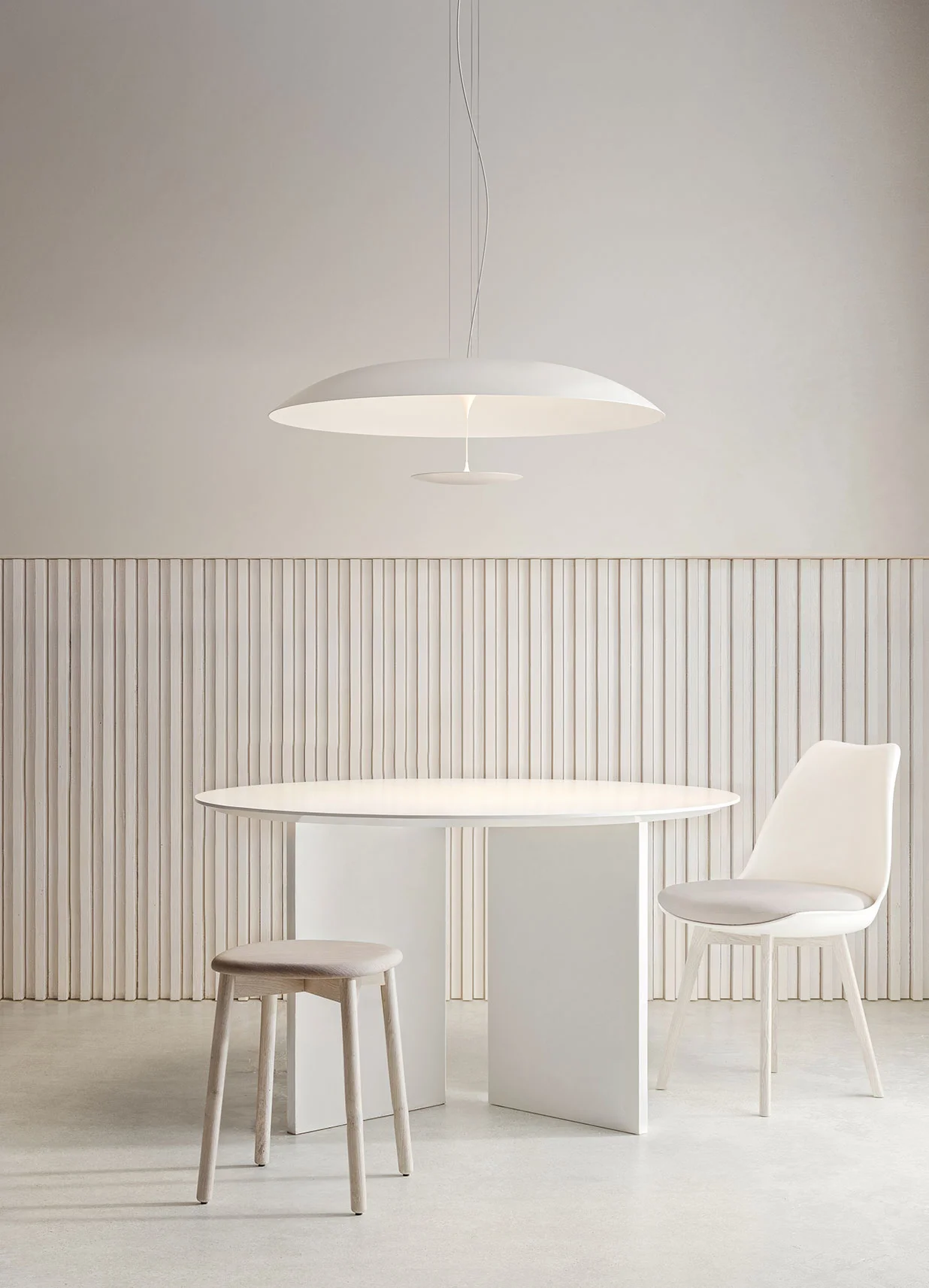 Żyrandol LED Karman BLANCO, zaprojektowany przez Matteo Ugolini, to połączenie wysmakowanego wzornictwa i praktycznego oświetlenia. Wykonany z wysokiej jakości aluminium w eleganckim, matowym białym odcieniu, doskonale wpisuje się w nowoczesne aranżacje wnętrz — od salonu, przez jadalnię, po kuchnię.