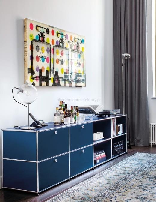 Ostatni z mebli USM Haller, jakie wybraliśmy dla Ciebie, to klasyczna szafka RTV. Składa się z trzech części. Na środku, na półkach da się umieścić odtwarzacz DVD czy kolekcję najlepszych płyt wraz z pilotami. Dwie boczne części są natomiast zamykane na opadające drzwiczki. Tylna ścianka ma otwory, przez które można poprowadzić całe okablowanie. To niezwykle stylowy, oryginalny mebel, który sprawdzi się w każdym salonie minimalistycznym bądź nowoczesnym.