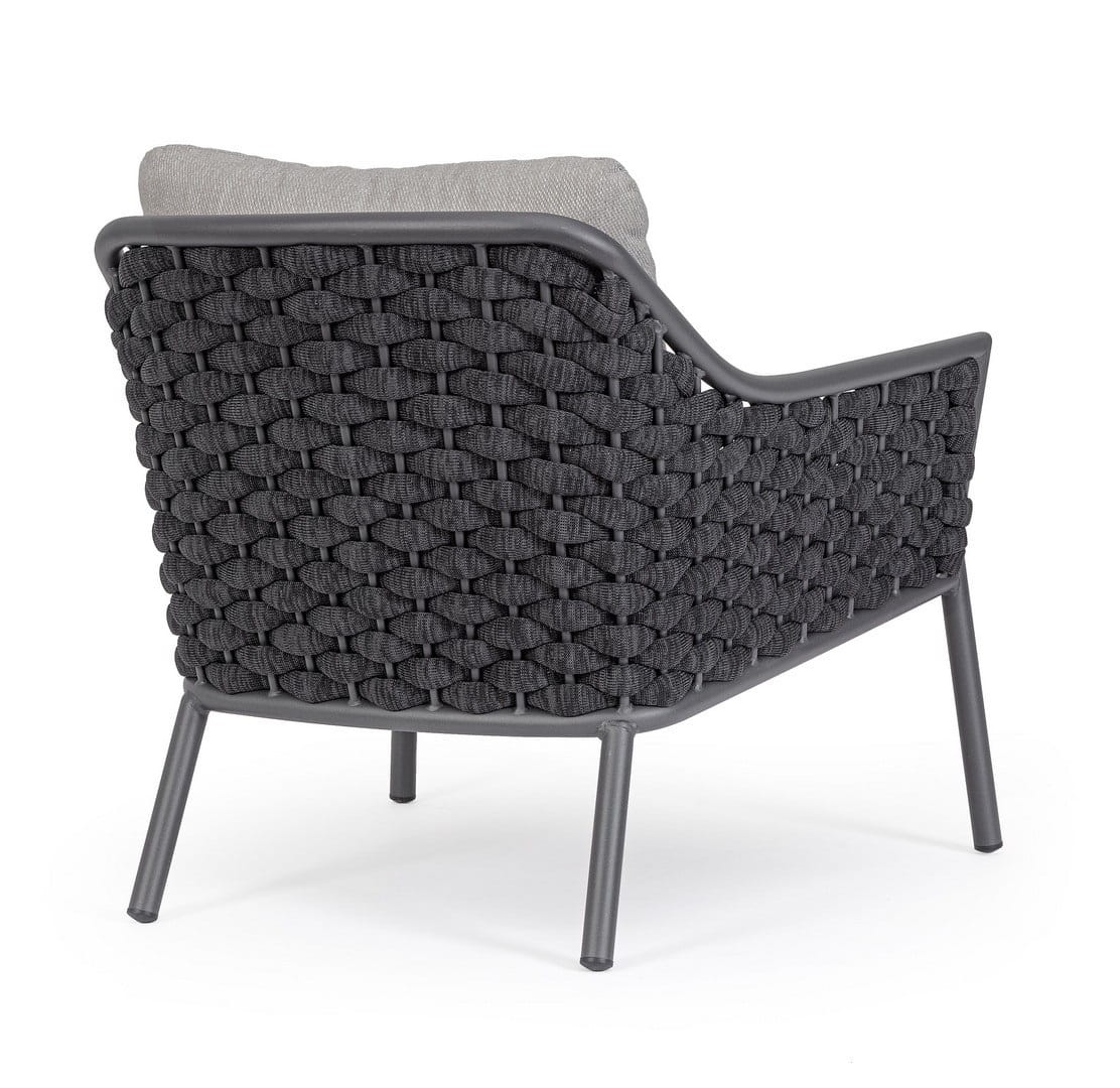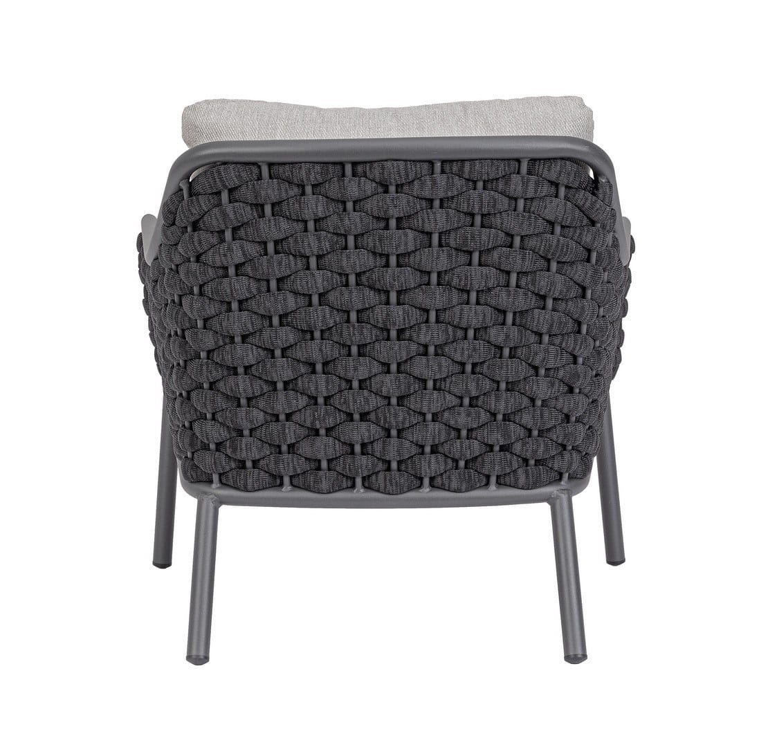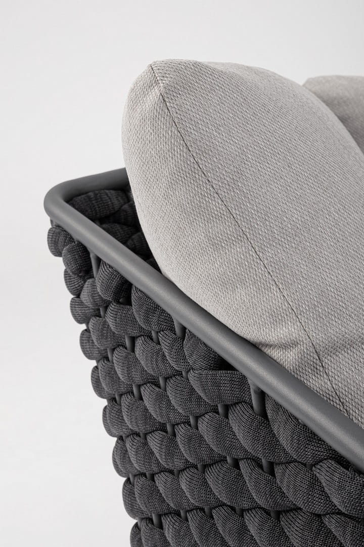 Krzesło z aluminiową ramą malowaną proszkowo (poliestr), charakteryzujące się lekką, ale solidną konstrukcją. Siedzisko i oparcie wykonane z tkaniny typu Textilene, z plecionką z liny tekstylnej wypełnionej gumą nitrylową, zapewniającą wygodę i wytrzymałość. Poduszka siedziska z zdejmowaną poszewką wykonaną z wodoodpornej tkaniny olefinowej (100% polipropylen), co czyni je odpornym na wilgoć i warunki atmosferyczne. Idealne rozwiązanie do użytku na zewnątrz, łącząc komfort z nowoczesnym designem.