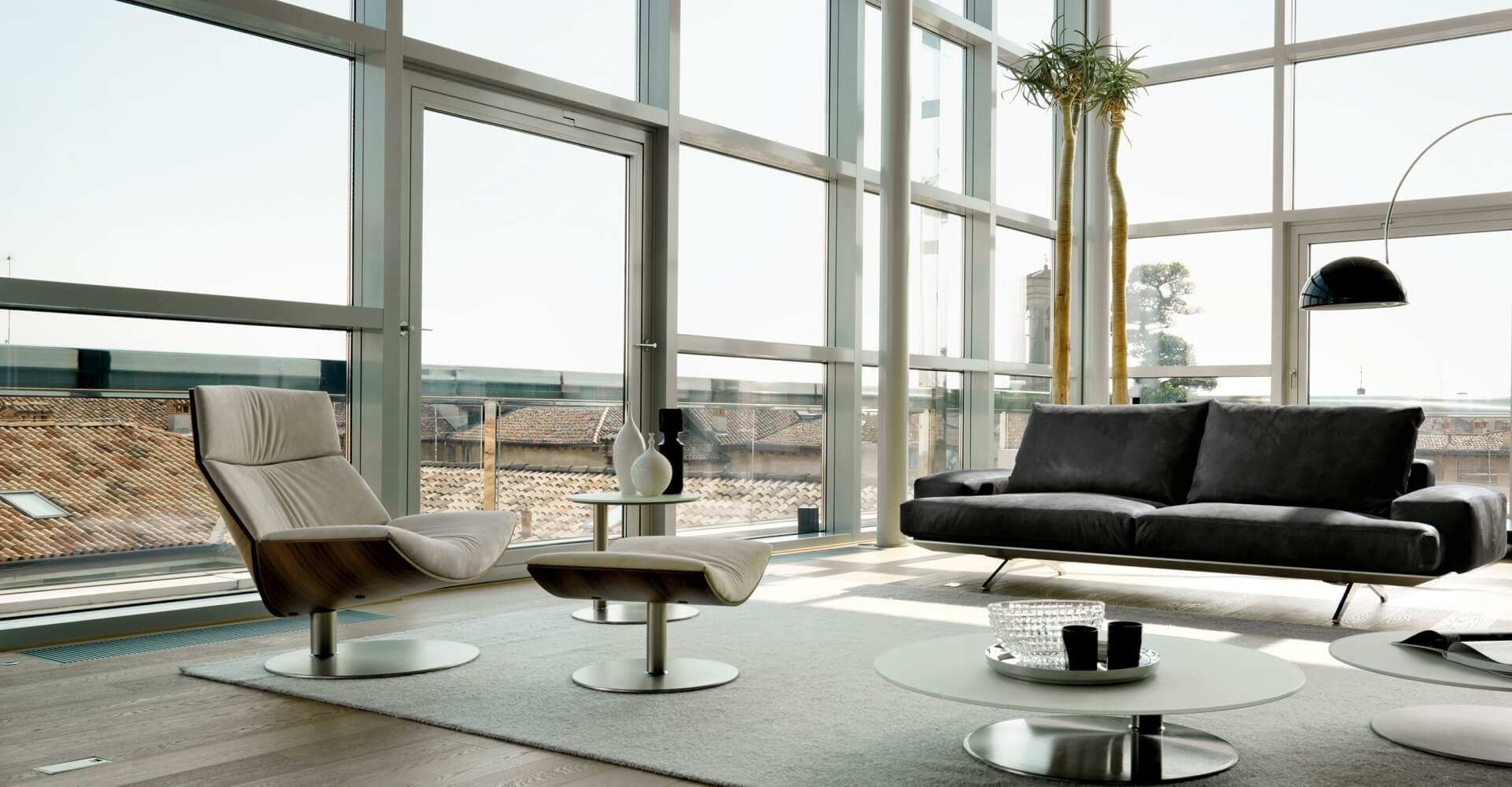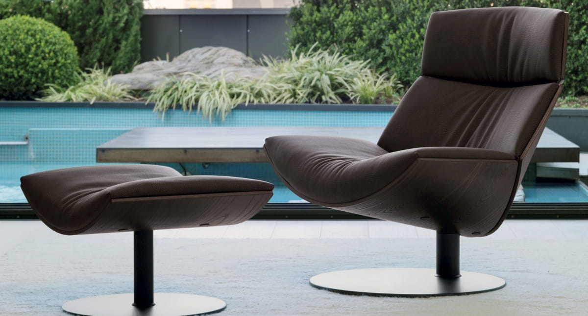 Fotel wykonany jest z metalowo-drewnianej ramy (do wyboru orzech lub jesion), która zapewnia stabilność i trwałość konstrukcji. Miękkie siedzisko oraz oparcie wypełnione pianką poliuretanową i tapicerowane wysokogatunkową skórą naturalną gwarantują wygodę nawet podczas długiego wypoczynku. Obrotowa, niklowana podstawa umożliwia swobodny ruch w zakresie 120°, podnosząc funkcjonalność mebla.