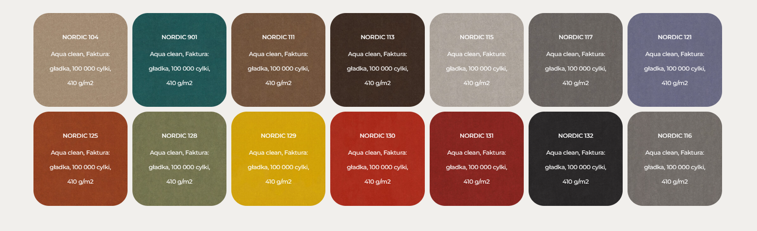Siedzisko: twarde lub tapicerowane, dostępne w różnych tkaninach i kolorach