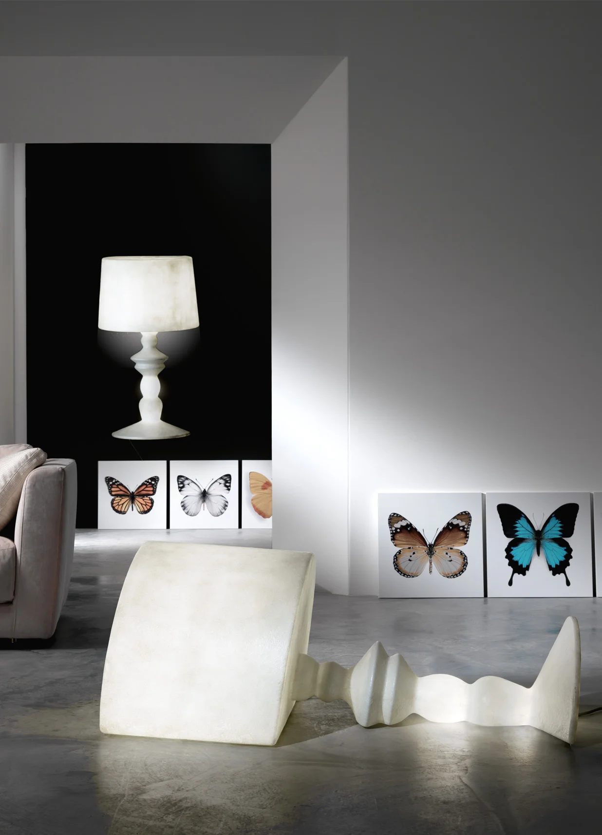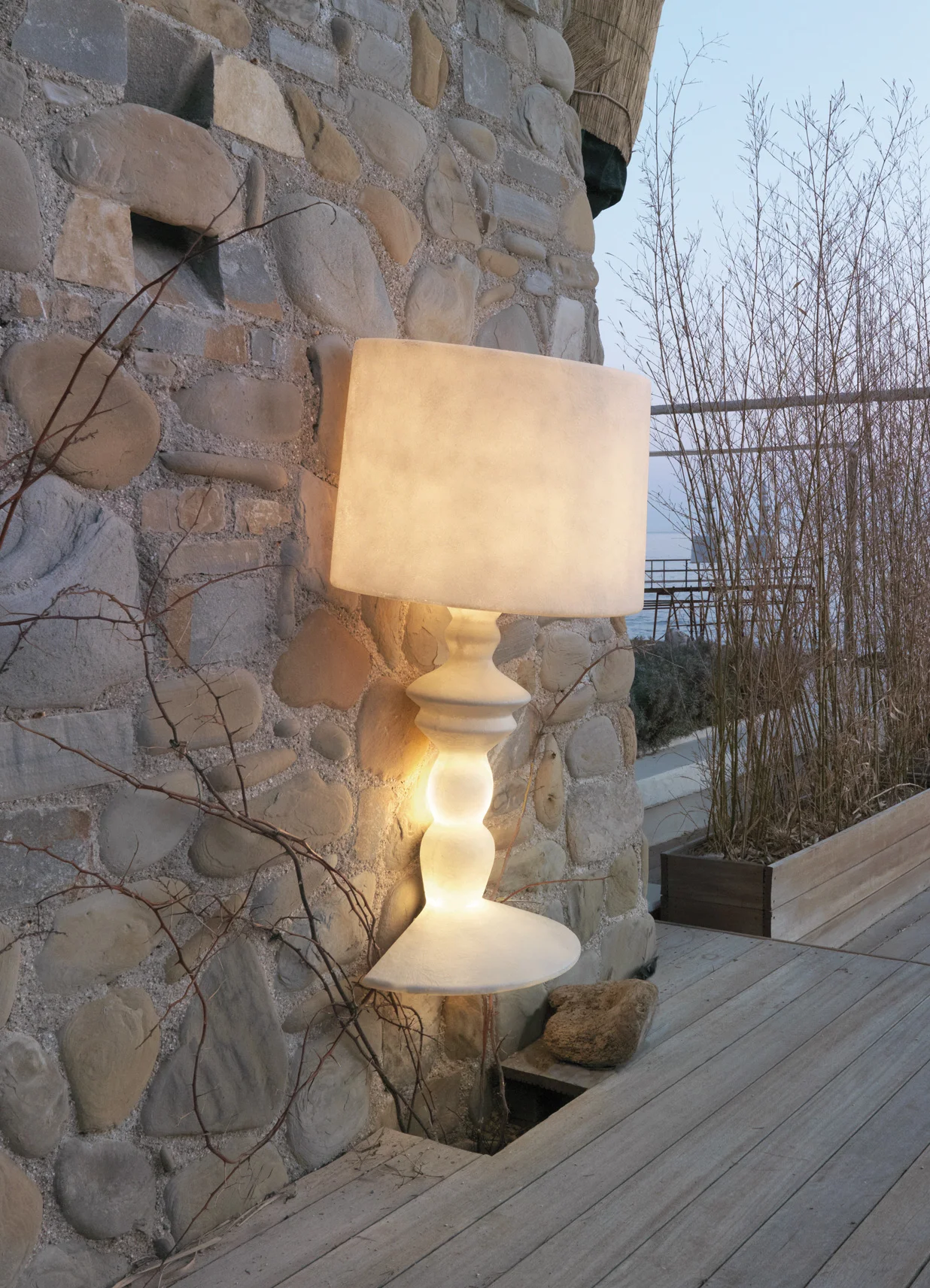 Wykonana z włókna szklanego o eleganckim, białym wykończeniu, zachwyca lekkością i subtelnym połyskiem powierzchni. Emituje miękkie, nastrojowe światło, wprowadzając do wnętrza atmosferę spokoju i wyrafinowania.