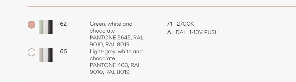 Vibia produkuje lampy Cosmos w kilku wykończeniach: matowy lakierowany ciemnobrązowy, matowy zielony, jasnoszary i biały matowy.