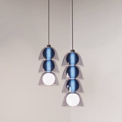 System składa się z sześciu elementów, które można dowolnie ze sobą łączyć: trzech kloszy o rosnących średnicach, nakładanych na świetliste, centralne źródło światła.