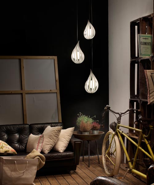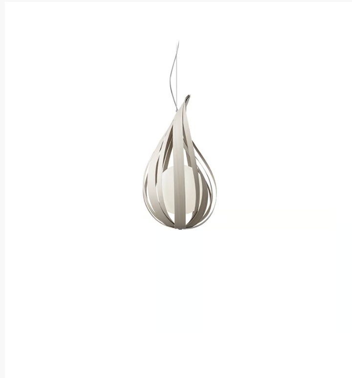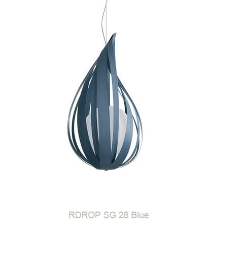 Źródłem światła Raindrop SM jest kulisty dyfuzor (wyposażony w żarówkę LED lub standardową), ukryty za uformowanymi w kształt kropli deszczu pasami forniru. Dzięki temu zabiegowi efekt wizualny jest widowiskowy. Fornir dostępny jest w dziewięciu kolorach, natomiast kabel zasilający lampy jest przezroczysty, dzięki czemu nie zaburza harmonii wnętrza. W trosce o stabilność żyrandola, dodatkowo jest on montowany do sufitu na mocnej, stalowej lince.