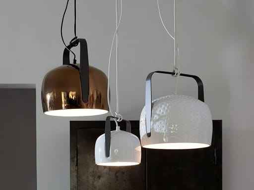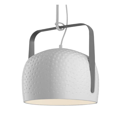 Bag to lampa o charakterystycznej, połyskującej ceramicznej obudowie, której miękka i opływowa forma nadaje wnętrzu subtelnej elegancji. Korpus lampy wsparty jest na metalowym uchwycie w kształcie rączki, co pozwala na jej montaż na suficie, podłodze lub ustawienie na stole, w zależności od wybranego wariantu.