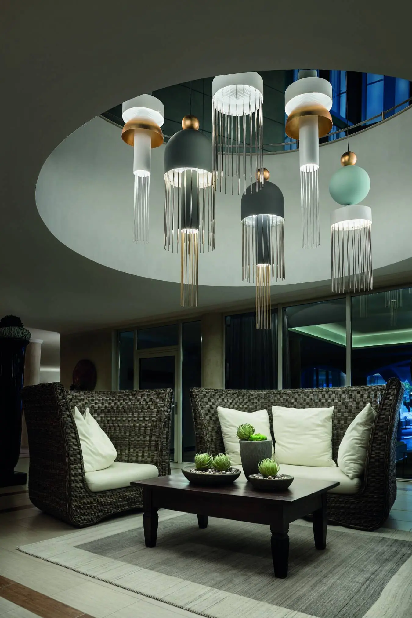 Oryginalne lampy LED Nappe to wyjątkowe dzieła projektu Marco Zito, łączące dekoracyjny styl z minimalistyczną abstrakcją. Inspiracją do ich powstania były klasyczne chwosty, co nadaje im unikalny charakter. Wykonane z metalu i szkła, dostępne w czterech wariantach kolorystycznych, pozwalają na tworzenie indywidualnych kompozycji i kreatywnych aranżacji oświetleniowych.