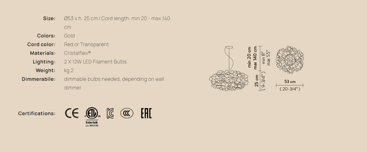 Każdy egzemplarz jest ręcznie składany przez rzemieślników Slamp, z wykorzystaniem innowacyjnych technopolimerów, które zapewniają lekkość, trwałość oraz perfekcyjne odwzorowanie detali. Charakterystyczna, wielowarstwowa forma subtelnie rozprasza światło, budując przytulną, nastrojową atmosferę.