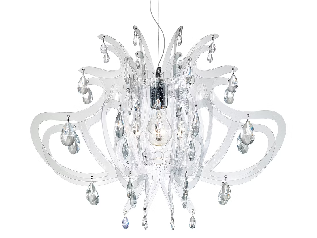 Konstrukcja lampy oparta jest na transparentnym szkielecie wykonanym w całości z innowacyjnego materiału Cristalflex®, który nadaje jej szlachetny połysk i wyjątkową lekkość wizualną. Kompozycję dopełniają 42 precyzyjnie rozmieszczone elementy przypominające kryształy, które pięknie rozpraszają światło, tworząc elegancką grę refleksów.
