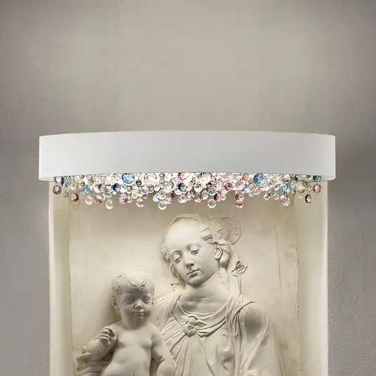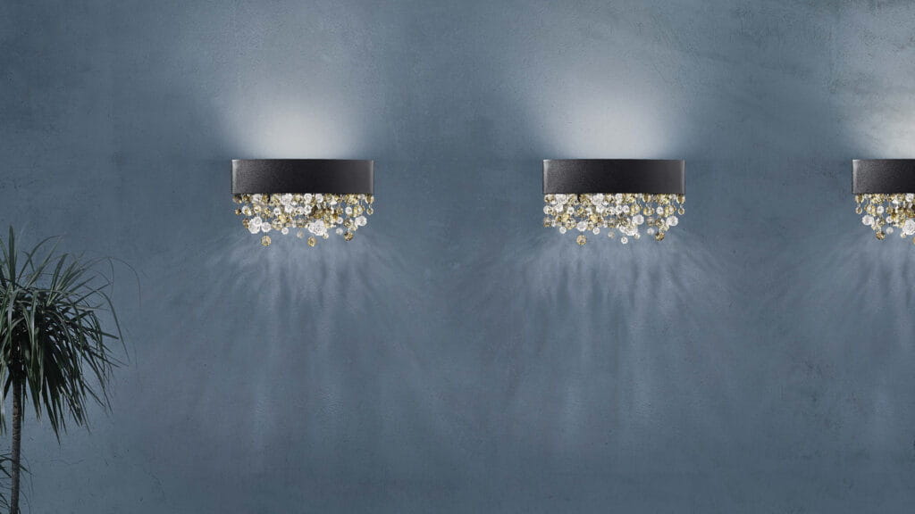 O wyjątkowości kinkietu Ola Masiero decydują przede wszystkim szklane kryształy, umieszczone w jego dolnej części. Nadają mu one nie tylko elegancki wygląd, ale dodatkowo efektownie odbijają światło i rzucają barwne odbłyski.