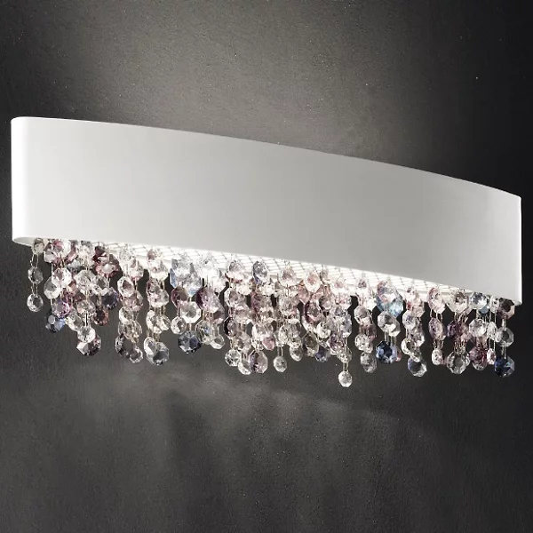 Do wykonania kinkietu zastosowano metal malowany na biało oraz szklane kryształy w różnych odcieniach.