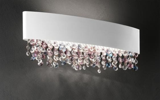 Do wykonania kinkietu zastosowano metal malowany na biało oraz szklane kryształy w różnych odcieniach.