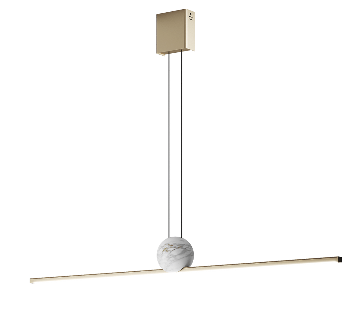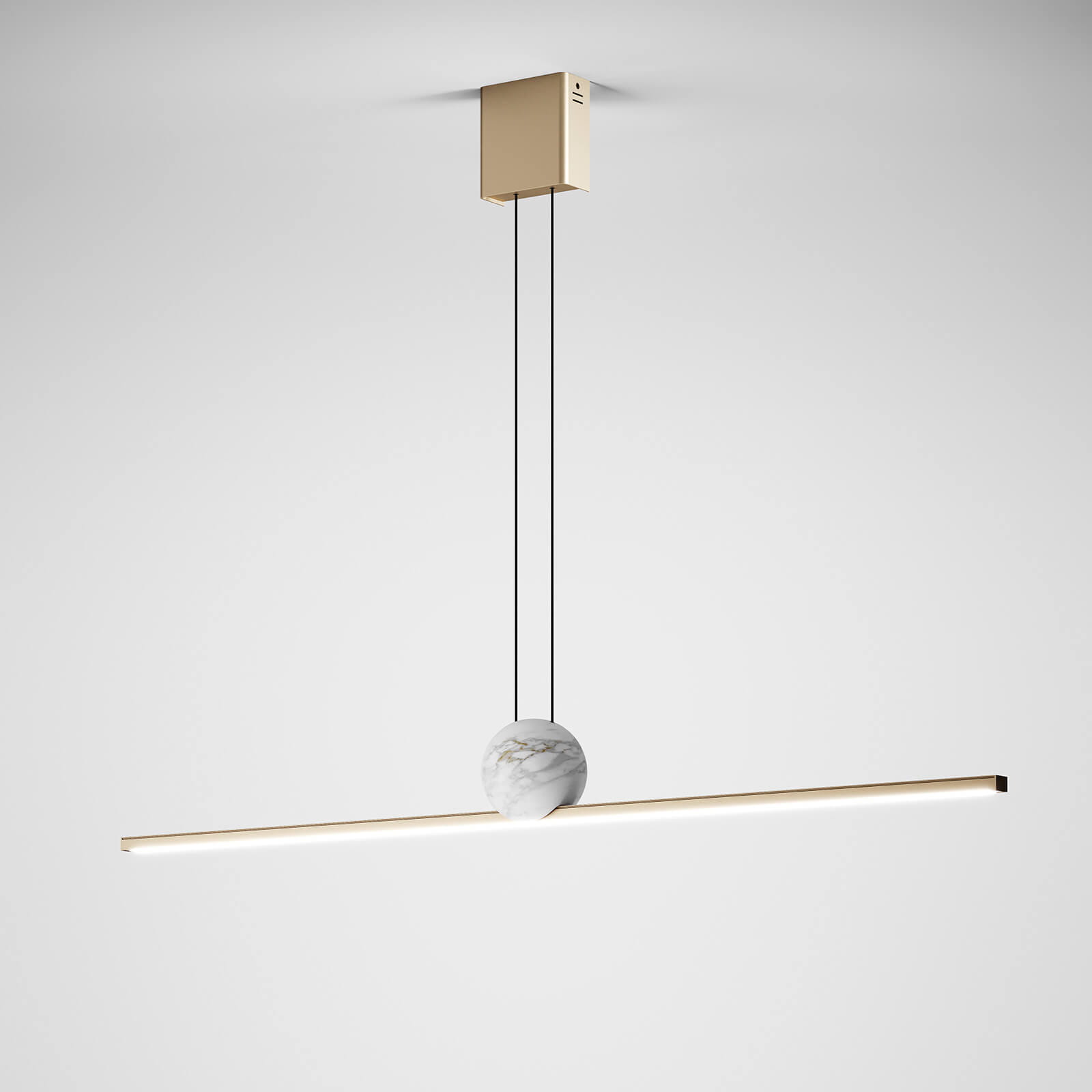 W metalowej szynie w subtelnym, szampańskim kolorze umieszczono energooszczędny pasek LED o mocy 24W i ciepłej barwie światła 3000K, który zapewnia przyjemne, nastrojowe oświetlenie. Całość dopełnia naturalny marmur, starannie dobrany kolorystycznie, do którego przymocowana jest szyna – element ten nadaje lampie luksusowego charakteru.