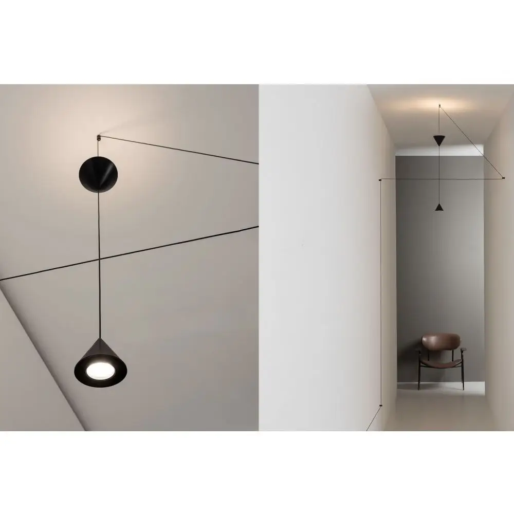 Jednym z najbardziej charakterystycznych elementów Filomeny jest 8-metrowy kabel, który pozwala na swobodne prowadzenie oświetlenia po ścianie i suficie, tworząc efektowne, indywidualne aranżacje świetlne. W zależności od modelu, możliwe jest zawieszenie dwóch stożkowych źródeł światła – mniejszego, kierującego światło w dół, oraz większego, emitującego je ku górze. Takie rozwiązanie umożliwia zarówno funkcjonalne doświetlenie przestrzeni, jak i budowanie nastrojowej atmosfery.