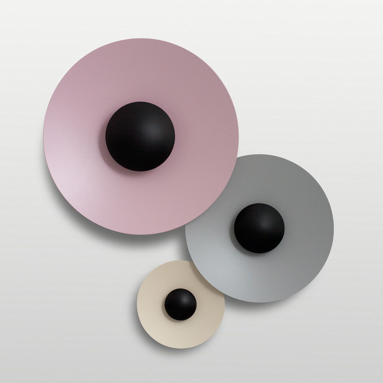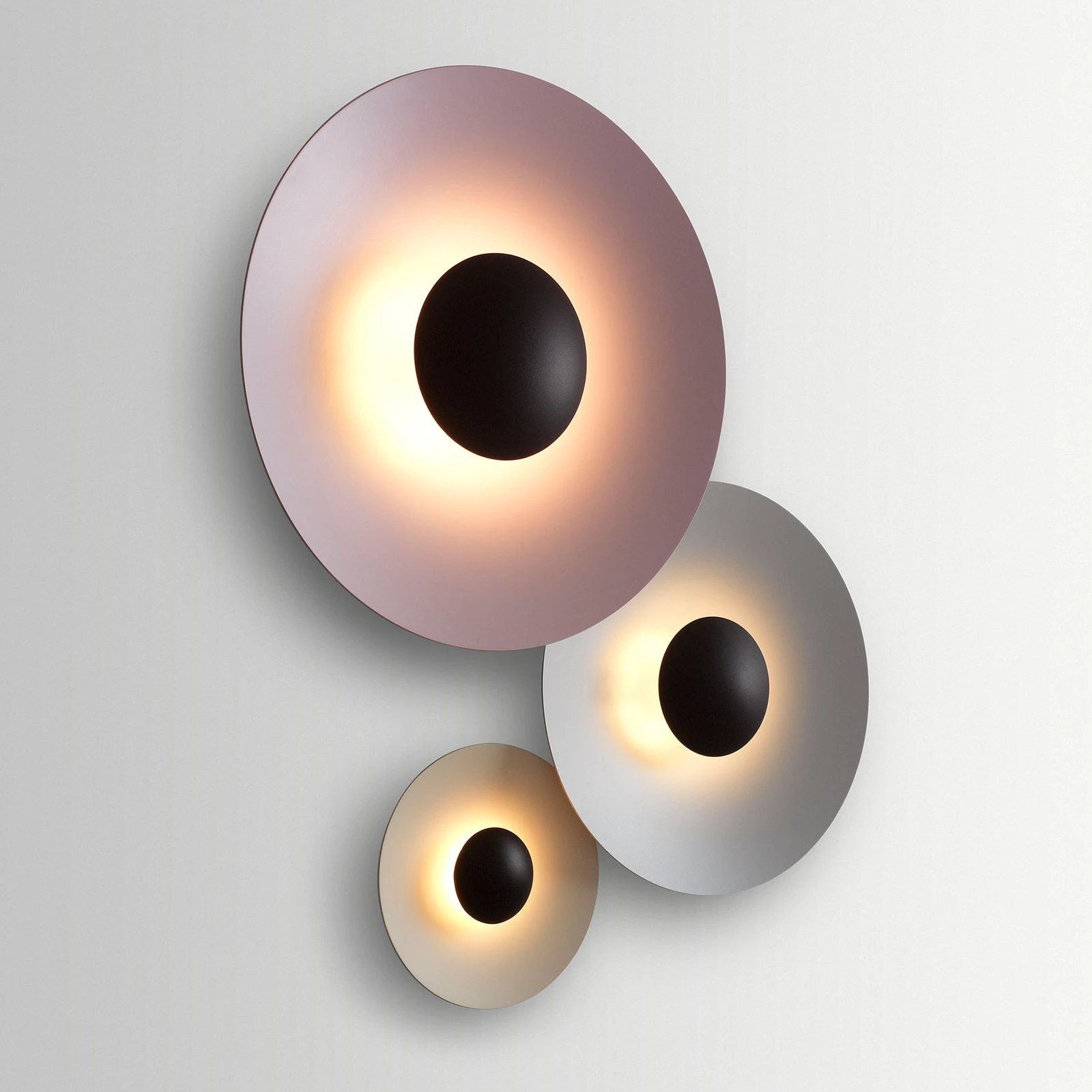 Na zdjęciu widać kompozycję trzech kinkietów w różnych rozmiarach i wykończeniach kolorystycznych – delikatnym pudrowym różu, eleganckiej bieli oraz ciepłym beżu. Takie zestawienie pozwala stworzyć efektowną, artystyczną instalację świetlną.