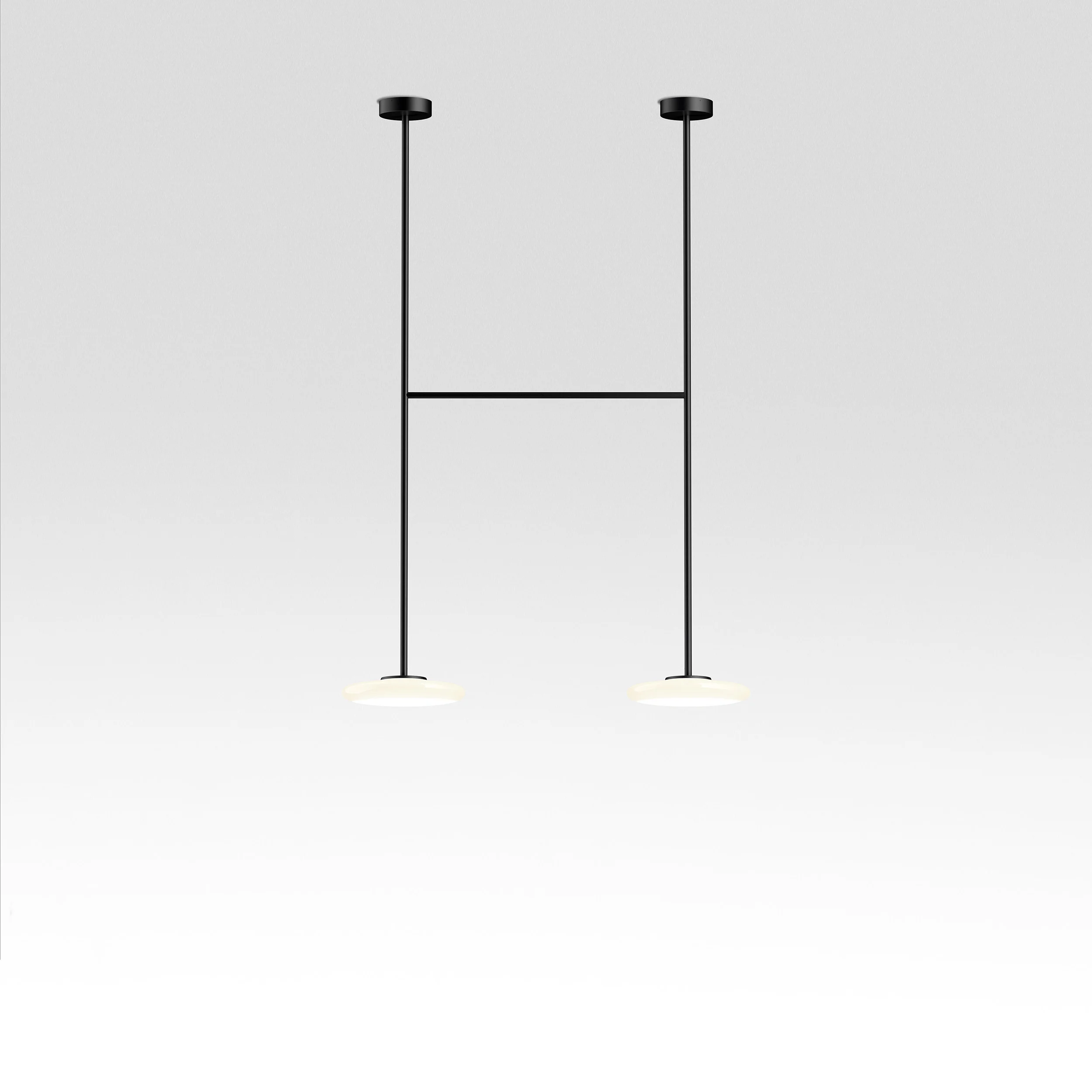 System składa się z opalowych, ręcznie dmuchanych kloszy ze szkła, które zachwycają miękkością wizualną i subtelnym rozproszeniem światła. Ich niemal plastyczna forma kontrastuje z czarną, metalową konstrukcją, która nadaje całości stabilność i definiuje jej geometrię. To właśnie napięcie pomiędzy kruchością szkła a zdecydowaną linią metalu tworzy tożsamość Ihany – lampy będącej syntezą przeciwieństw.