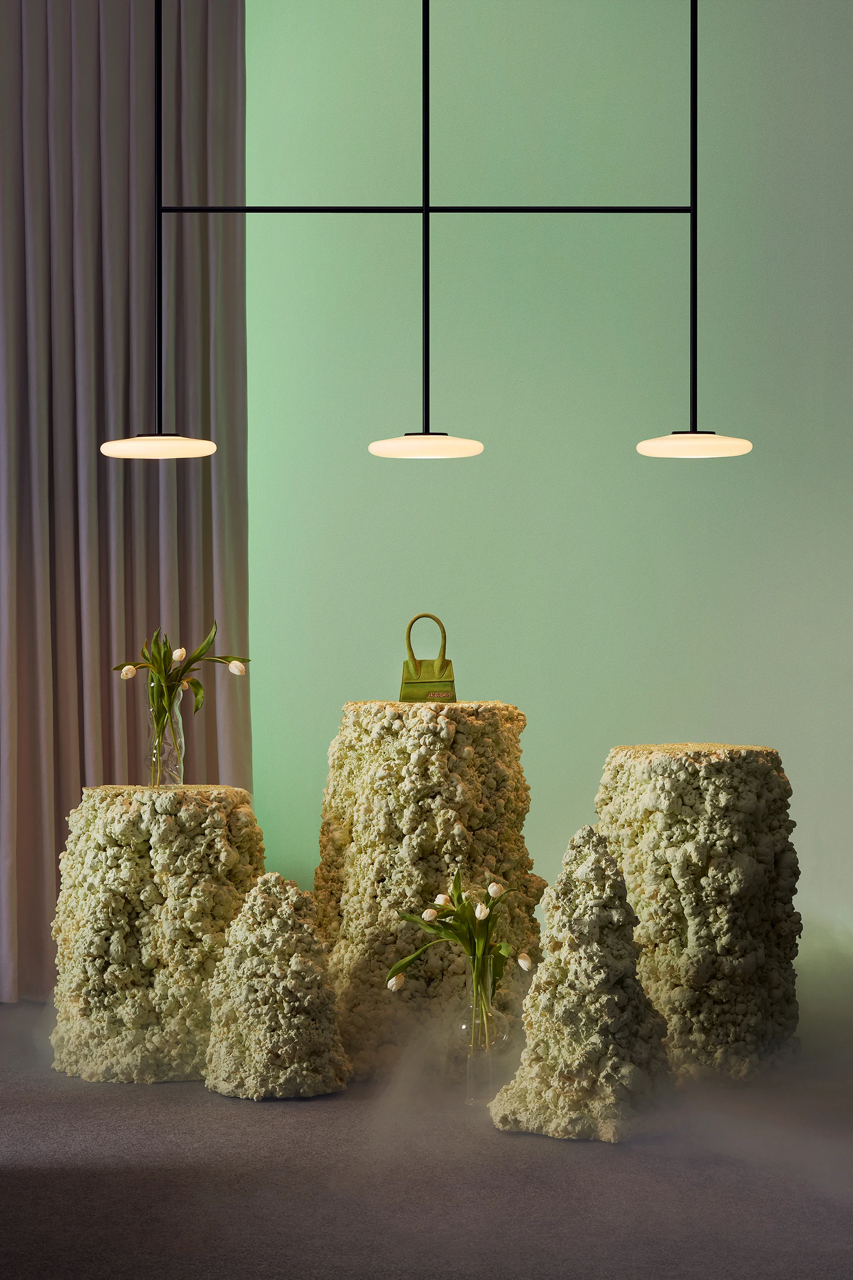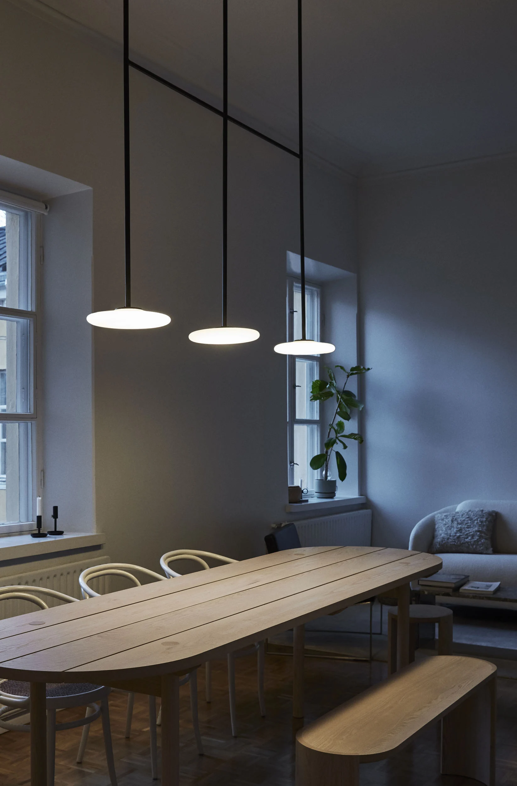 System składa się z opalowych, ręcznie dmuchanych kloszy ze szkła, które zachwycają miękkością wizualną i subtelnym rozproszeniem światła. Ich niemal plastyczna forma kontrastuje z czarną, metalową konstrukcją, która nadaje całości stabilność i definiuje jej geometrię. To właśnie napięcie pomiędzy kruchością szkła a zdecydowaną linią metalu tworzy tożsamość Ihany – lampy będącej syntezą przeciwieństw.