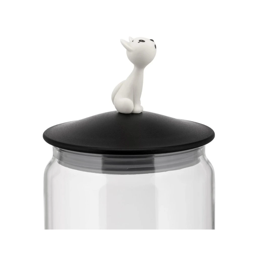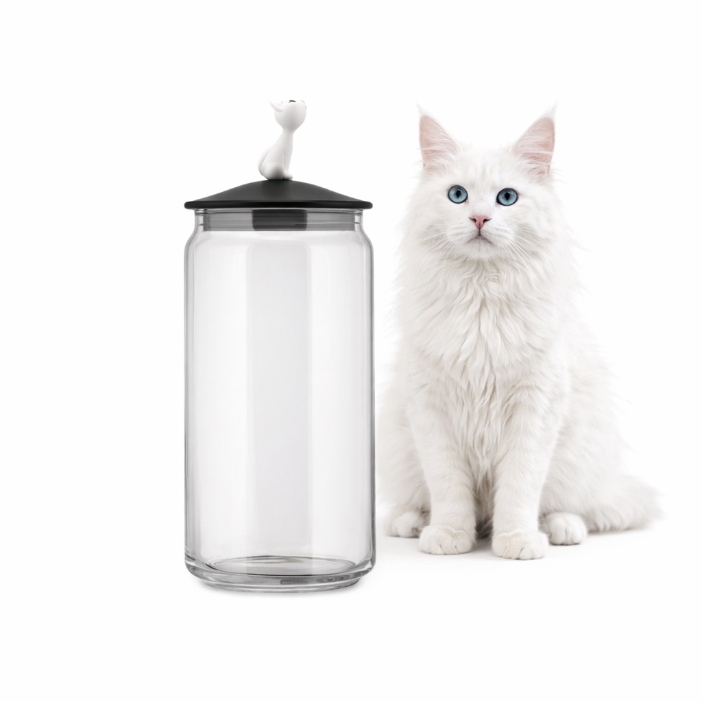 Szklany słój zamykany jest efektownym wieczkiem, którego forma nawiązuje do kultowych misek na karmę Mio. Uchwyt i jednocześnie dekoracja umieszczona na pokrywie przedstawia miauczącego kota domagającego się posiłku — motyw identyczny z tym, który zdobi miski z tej samej serii. Ten zabawny detal nadaje pojemnikowi wyjątkowego charakteru i sprawia, że MioJar staje się ozdobą kuchni, a nie tylko praktycznym akcesorium.