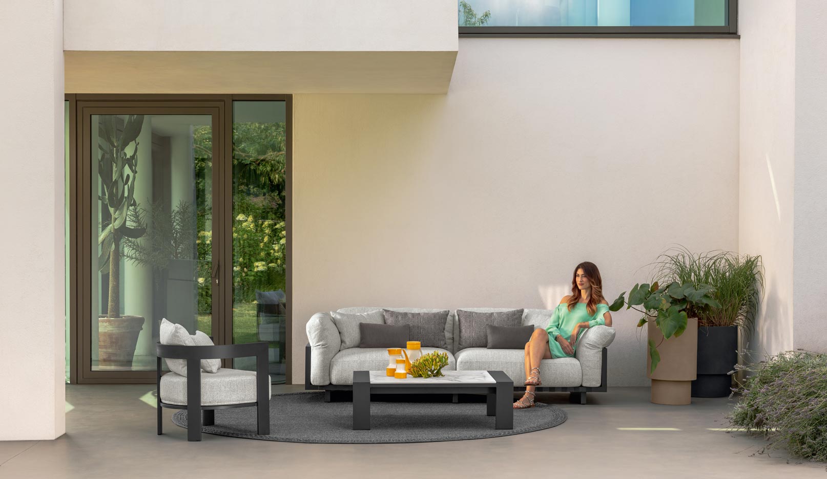 Stabilna konstrukcja z aluminium gwarantuje trwałość, lekkość wizualną oraz odporność na warunki atmosferyczne. Blat wykonany ze spieku kamionkowego (stoneware) zachwyca szlachetnym wykończeniem i dostępny jest w różnych wariantach kolorystycznych, co pozwala idealnie dopasować stolik do charakteru przestrzeni.