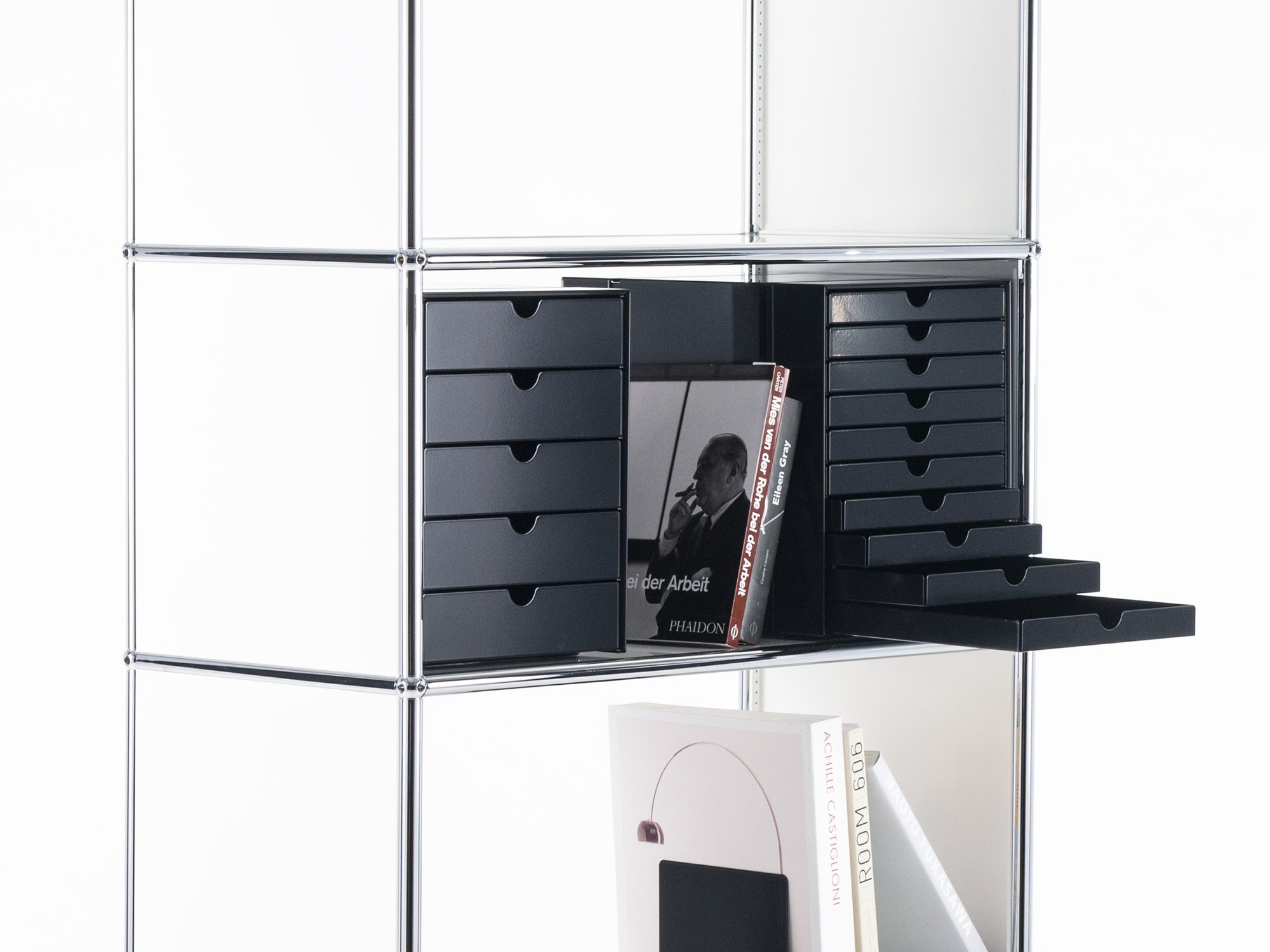 Minimalistyczna forma, redukowana do niezbędnych elementów, oraz wysoka jakość wykonania sprawiają, że akcesoria USM Inos doskonale komponują się z estetyką systemu USM Haller. Dzięki modułowej konstrukcji umożliwiają indywidualne dopasowanie wnętrza regałów, szafek i kontenerów – zarówno w przestrzeniach biurowych, jak i domowych.