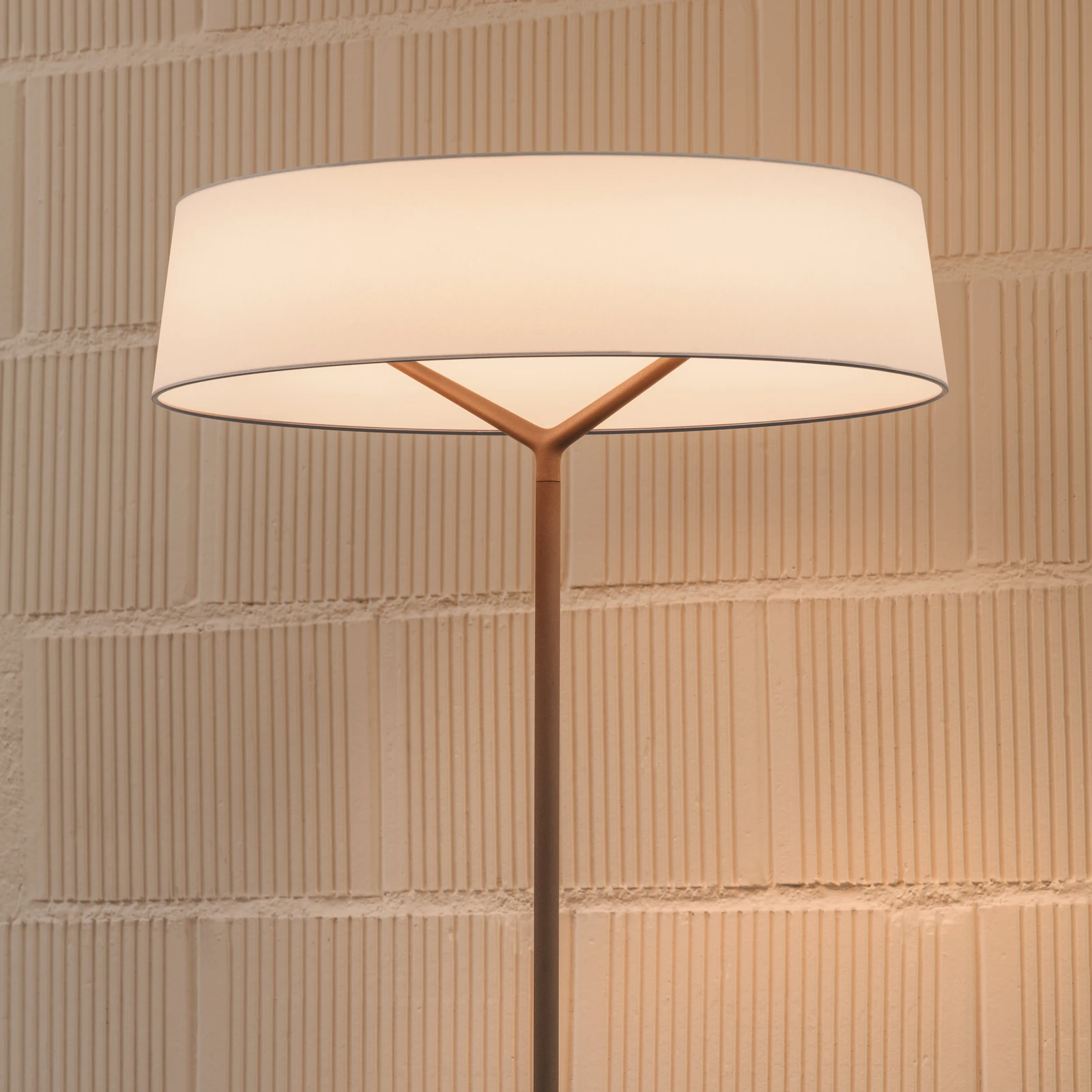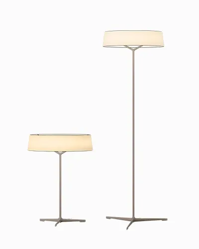 Lampy stołowe i podłogowe z tej serii charakteryzują się elegancką, zrównoważoną konstrukcją – cylindryczny klosz osadzony jest na smukłym, aluminiowym trzonie, który rozgałęzia się w trzy stabilne nogi. Całość dostępna jest w dwóch starannie dobranych wykończeniach, podkreślających nowoczesny i ponadczasowy charakter projektu.