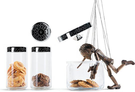 Pokrywka pojemnika została wykonana z polerowanej stali nierdzewnej, ozdobiona charakterystycznym, barokowym zdobieniem, które jest znakiem rozpoznawczym całej kolekcji Dressed. Ciekawe rozwiązanie stanowi dzwoneczek przytwierdzony do spodu pokrywki, który pełni funkcję praktycznego alarmu. W razie "włamania" do pojemnika, dzwoneczek natychmiast zaalarmuje właściciela przechowywanych w nim ciastek, dodając element zabawy do codziennej użytkowości.