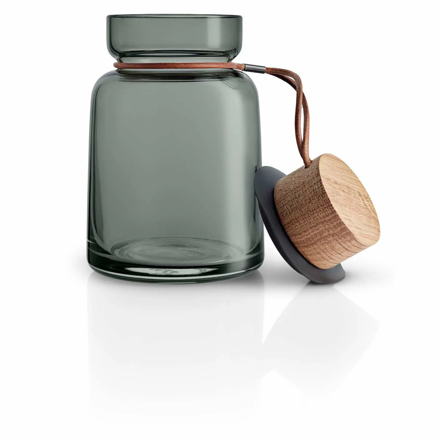 Ręcznie dmuchane szklane słoiki do przechowywania to idealny sposób na stylowe eksponowanie składników na otwartych półkach, dodając jednocześnie dekoracyjny akcent do wnętrza. Chłodny odcień dymionego szkła doskonale komponuje się ze stylem skandynawskiej kuchni, a całość dopełniają solidne, olejowane drewniane pokrywki z dębu, przymocowane do słoików za pomocą skórzanego paska.