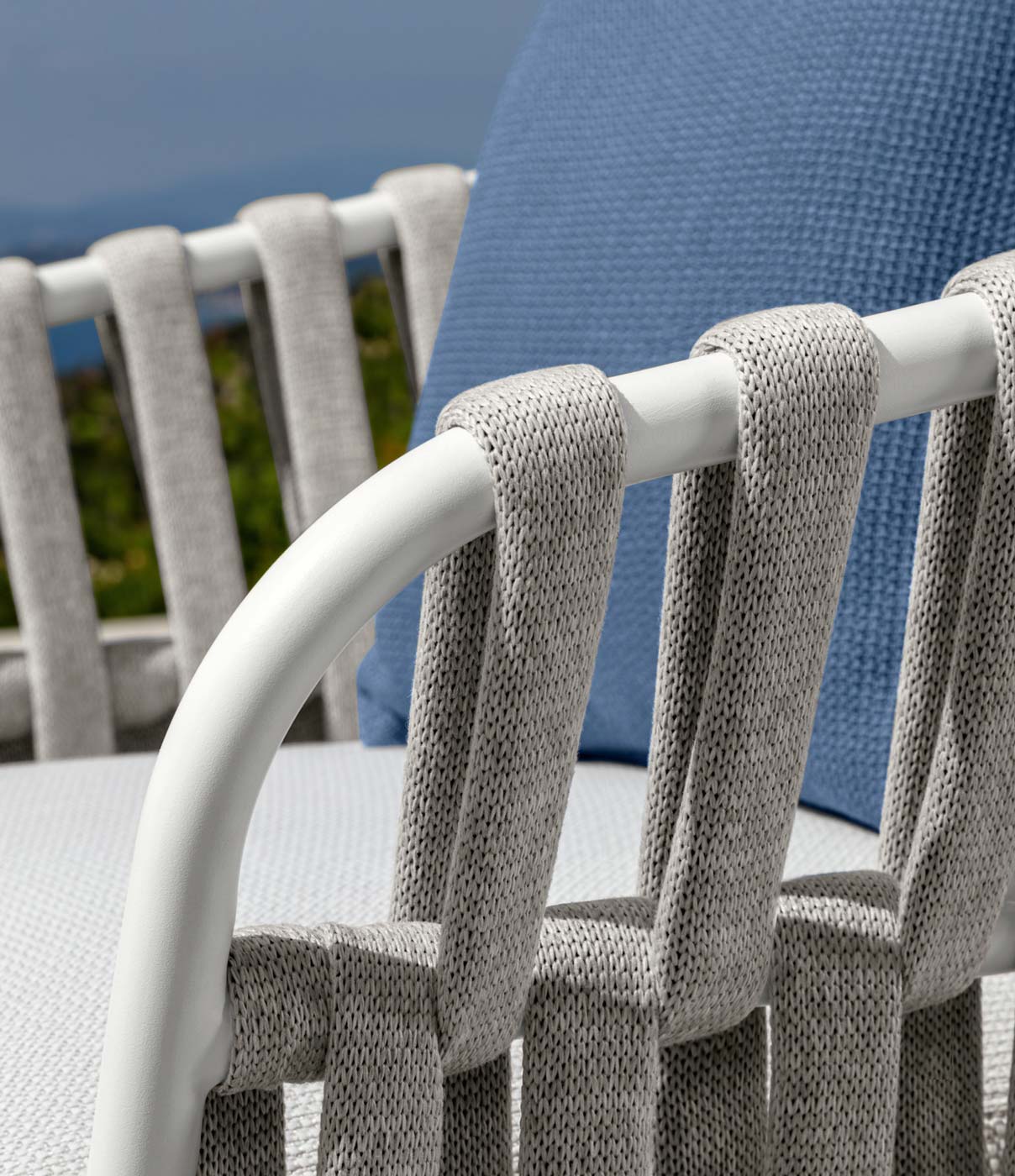 pufa Frame włoskiej marki Talenti charakteryzuje się tymi samymi kluczowymi elementami całej kolekcji: aluminiowa konstrukcja rurowa łączy funkcjonalność odpornego na warunki atmosferyczne materiału z elegancją falistych kształtów. Solidne i przyjemne siedzisko jest wzbogacone wyborem odważnych tkanin, używanych również do obicia obszernych miękkich poduszek oparcia. Przeplot wyściełanej liny na podłokietnikach i oparciu jest niepowtarzalnym detalem kolekcji, nadającym wyrafinowany i zmysłowy akcent temu meblowi.