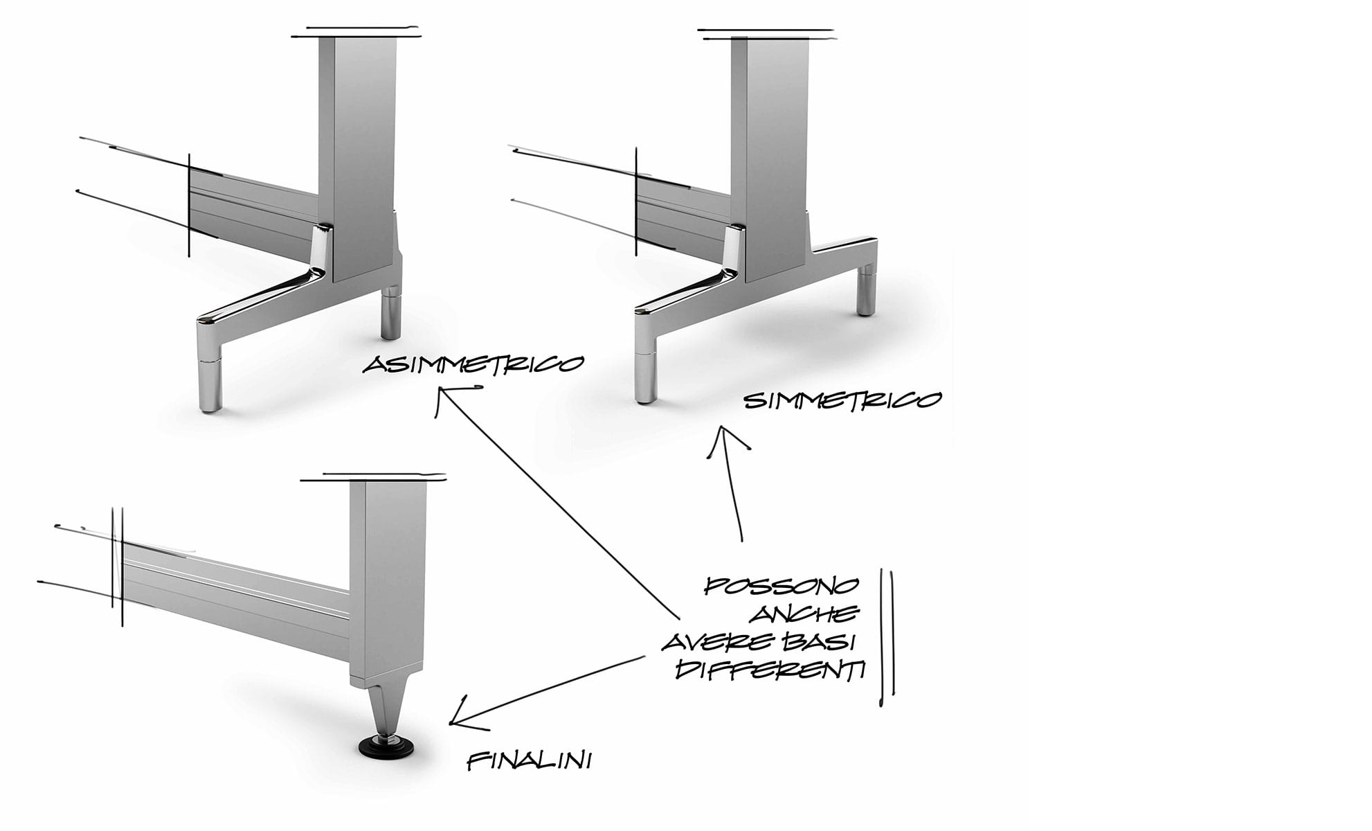 Symetryczna podstawa z odlewanego ciśnieniowo aluminium, dostępna w wykończeniu polerowanym lub malowanym, gwarantuje stabilność i trwałość. Podstawa osadzona jest na regulowanych prowadnicach podłogowych, pozwalających na dostosowanie wysokości o +/- 1,5 cm, co zapewnia równowagę i precyzyjne dopasowanie do powierzchni.