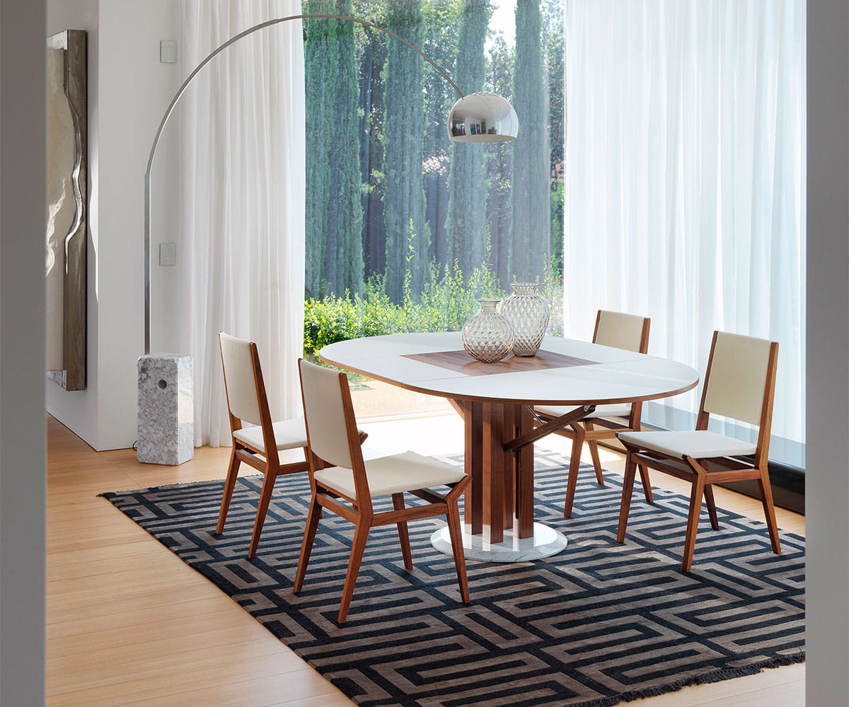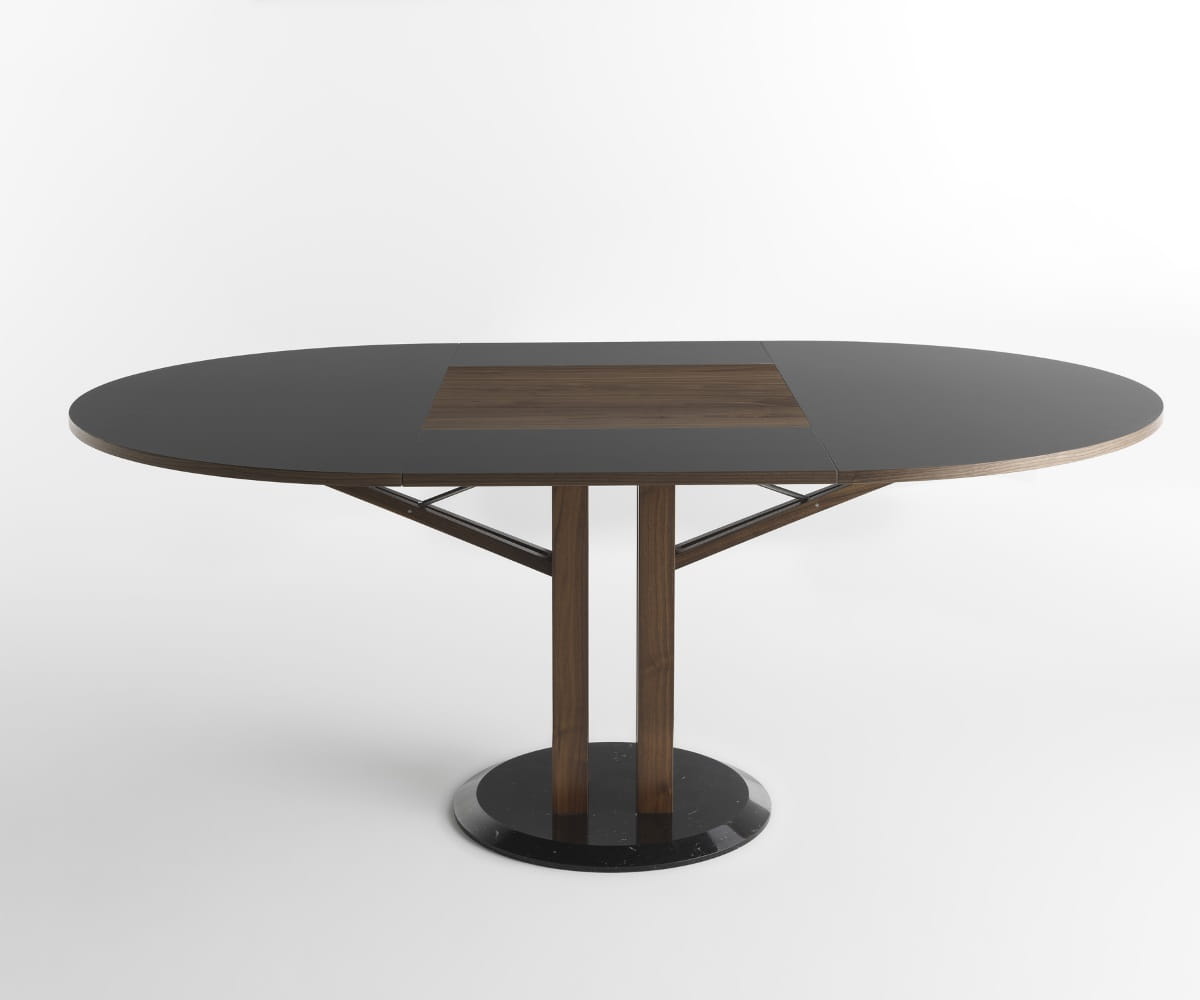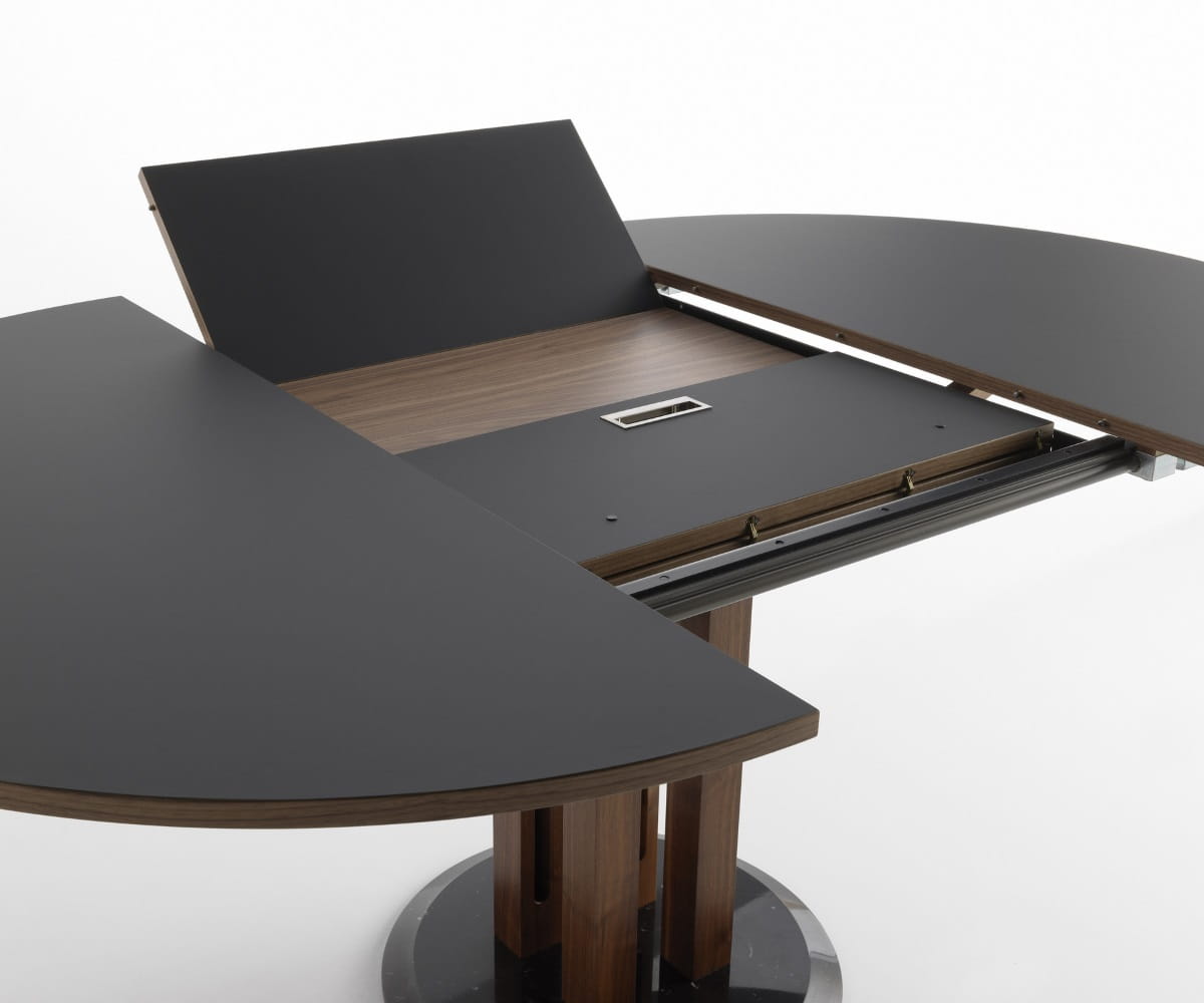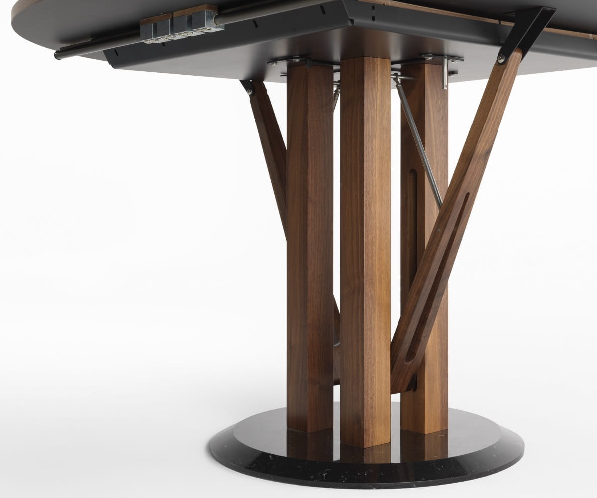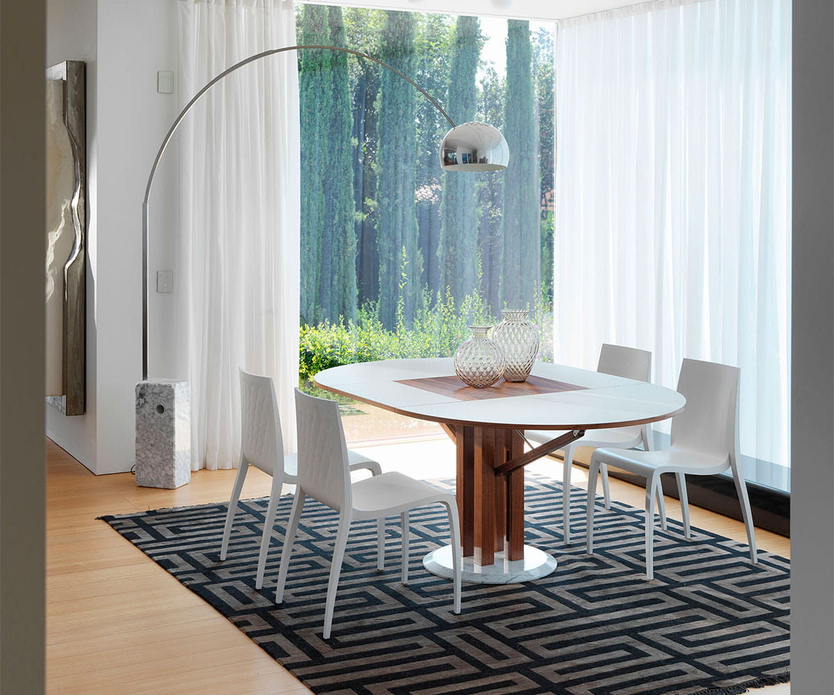 stół Flower włoskiej marki Horm jest efektem ekscytującej współpracy z dwoma mistrzami światowego designu, która zrodziła się z wyzwania: stworzenia rozkładanego okrągłego stołu, który byłby piękny zarówno zamknięty, jak i otwarty. Płaskie powierzchnie przesuwają się bez użycia prowadnic, dzięki rozwiązaniu technicznemu, które jest jednocześnie estetyczne: ruchomemu ramieniu przypominającemu rzymski dźwig. Przedłużenie stołu wysuwa się i otwiera jak kwitnący kwiat, pokazując, że estetyka jest naturalnym wynikiem dobrego projektu, stworzonego w wyniku technicznego poszukiwania prostoty i funkcjonalności.