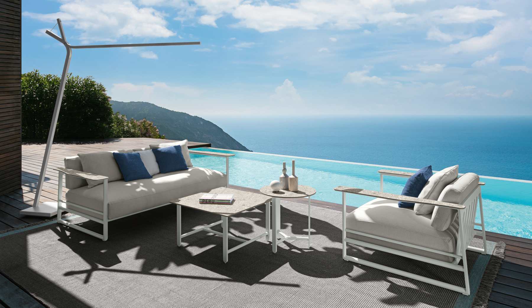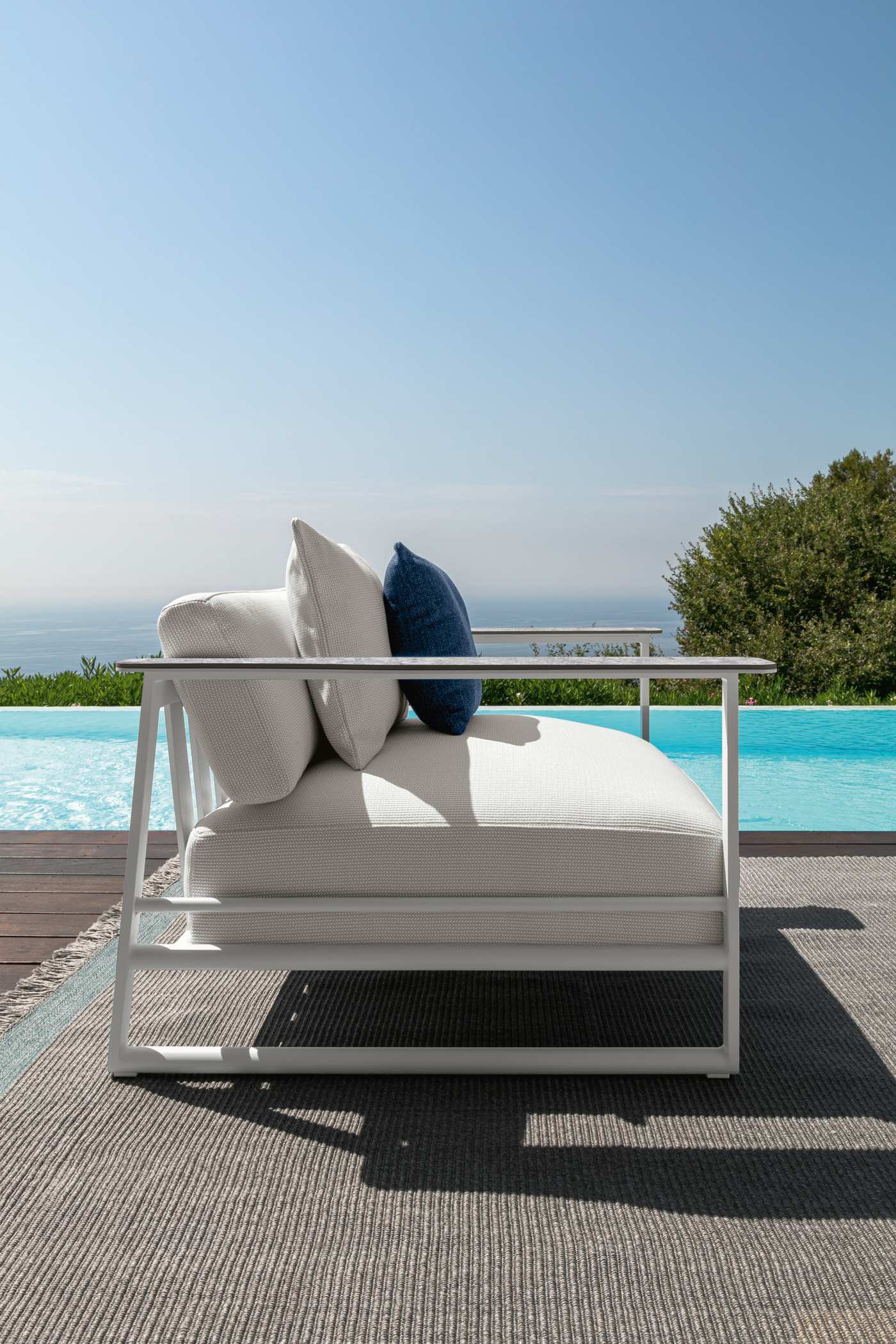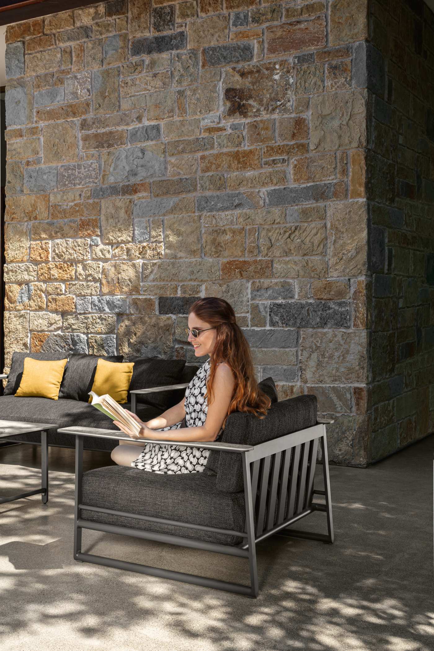 Dwumiejscowa sofa Riviera wyróżnia się eleganckimi i jasnymi liniami, które doskonale dopasowują się do przestrzeni na zewnątrz. Dopracowana estetyka i szlachetne materiały nie wpływają negatywnie na funkcjonalność tego produktu, którą zapewnia aluminiowa rama. Szybkoschnąca piankowa wyściółka jest obita odpornymi na warunki atmosferyczne i zdejmowanymi pokrowcami, dostępnymi w trzech różnych kolorach, mądrze połączonych z odcieniami ramy i podłokietników z gresu.