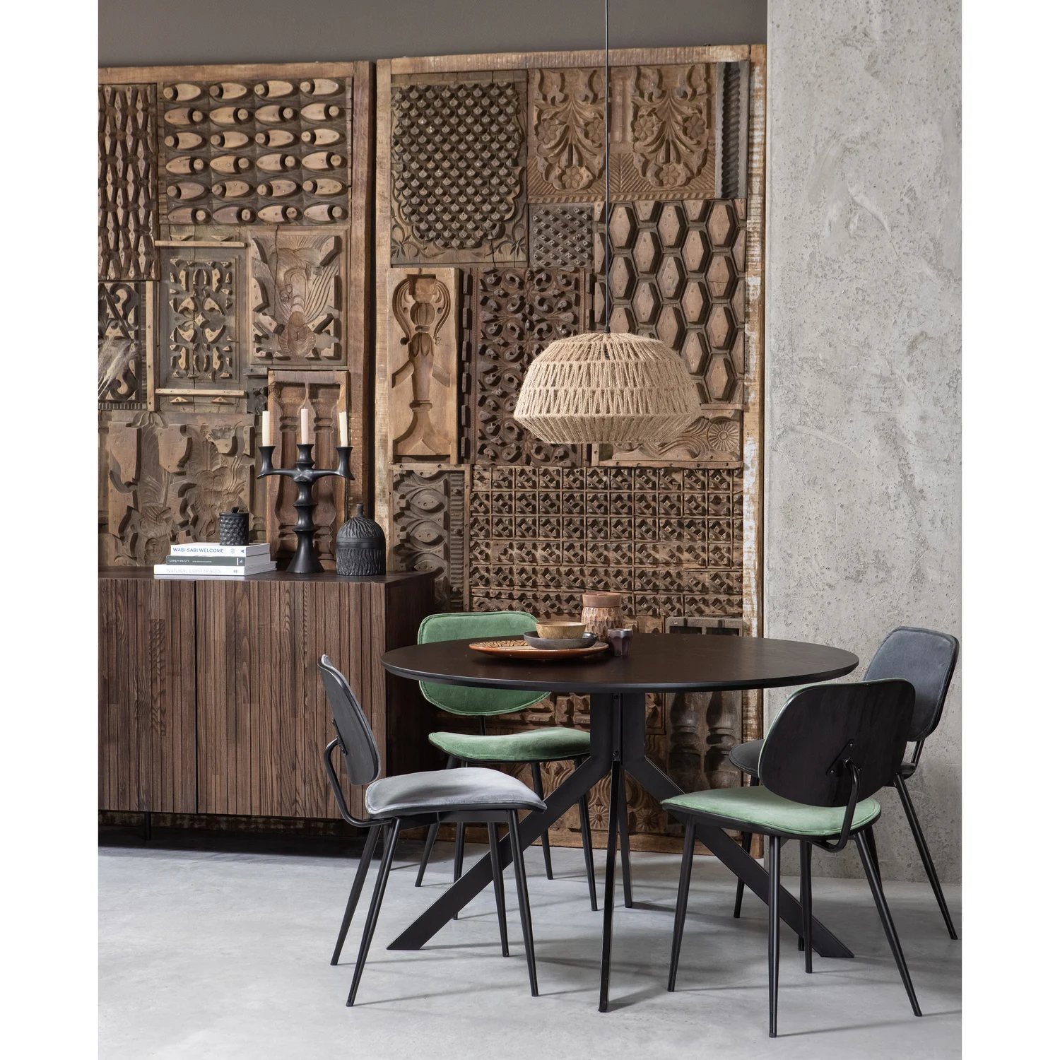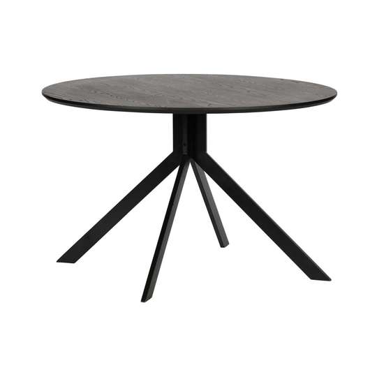 Blat stołu wykonany jest z płyty MDF o średnicy 120 cm i grubości 25 mm. Powierzchnia blatu została tłoczona i wykończona w matowej czerni, co nadaje mu nowoczesny wygląd i subtelną strukturę. Stabilność konstrukcji zapewnia stalowa rama malowana na czarno, z czterema nogami wychodzącymi z centralnej części stołu, co gwarantuje komfort użytkowania i dużą ilość miejsca na krzesła.