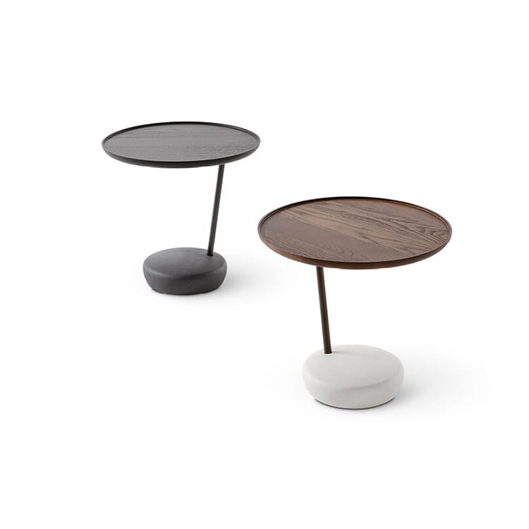 Blaty stolika wykonane są z dysków z drewna jesionowego, wspartych na metalowej nodze malowanej na kolor ołowiu. Całość spoczywa na podstawie z marmuru lub betonu, która nawiązuje do solidnej, stabilnej formy skały. Trwały obraz nowoczesnego stolika kawowego Lupino to asymetryczny kontrast między masywną podstawą, smukłym trzonem i dyskiem tworzącym blat, podkreślony eleganckim połączeniem różnych materiałów. Baza :cement blat : drewno jesionowe