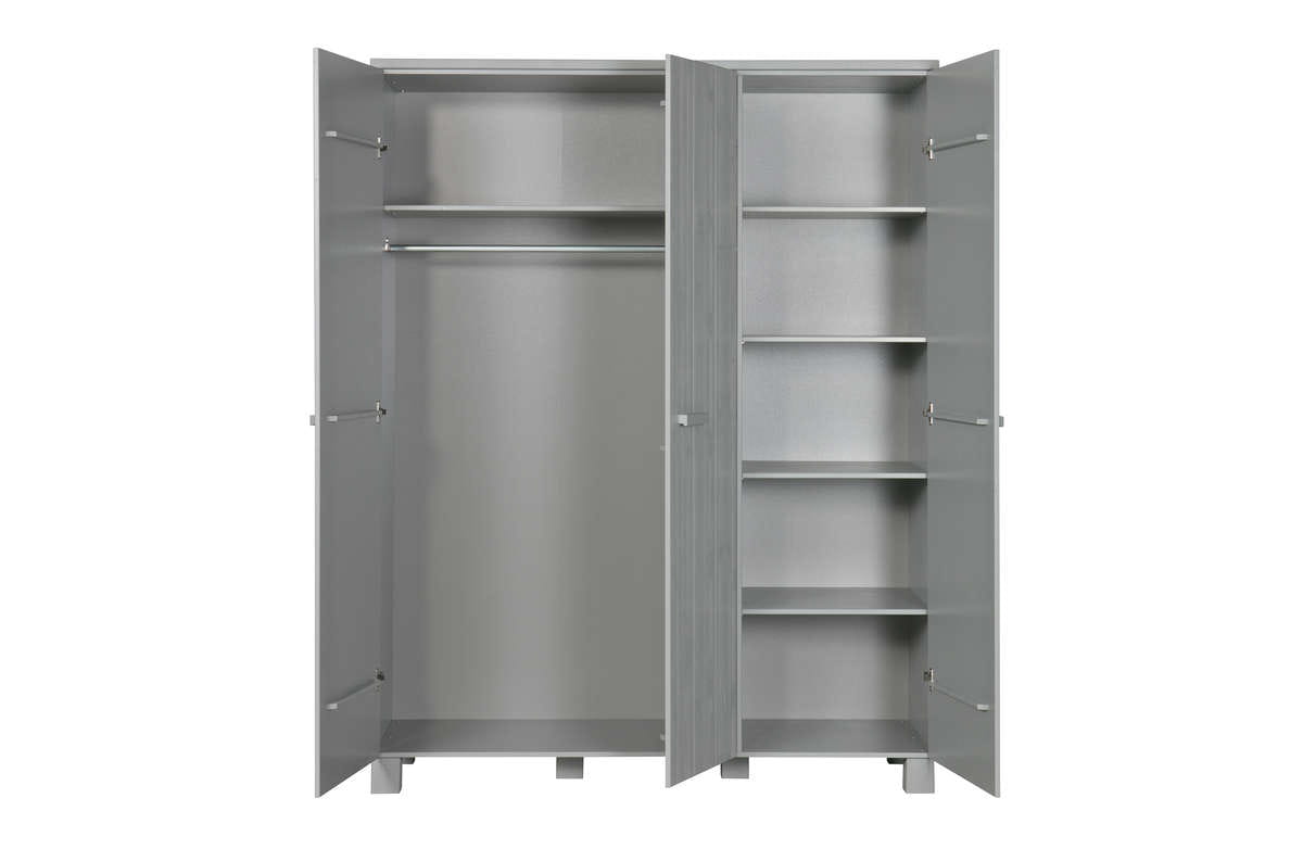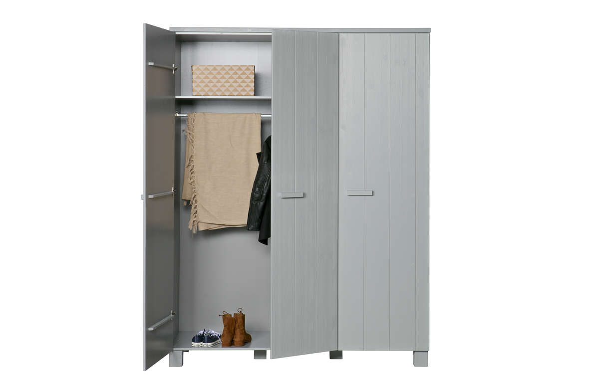 Solidna, trzydrzwiowa szafa WOOOD to pojemny i wytrzymały mebel, który doskonale sprawdzi się w sypialni, garderobie lub przedpokoju. Jej masywna forma oraz surowy charakter podkreślają naturalne piękno drewna i idealnie wpisują się w aranżacje nowoczesne, loftowe oraz rustykalne.
