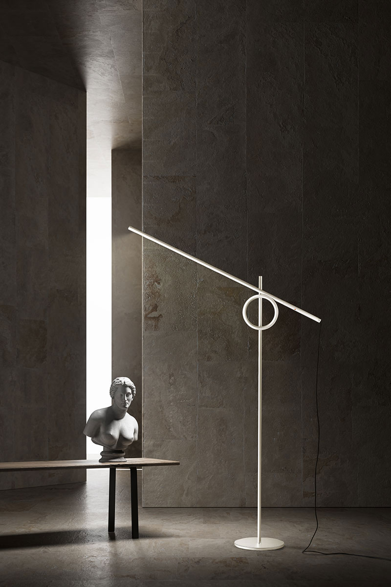 Lampa składa się z dwóch głównych elementów: liniowego modułu LED z wbudowanym ściemniaczem, umieszczonego w tubie świetlnej, oraz pierścienia osadzonego na podstawie. Poprzez grę napięcia, tarcia i równowagi użytkownik może dowolnie kształtować efekt światła – od subtelnych, nastrojowych akcentów po mocniejsze, funkcjonalne oświetlenie.