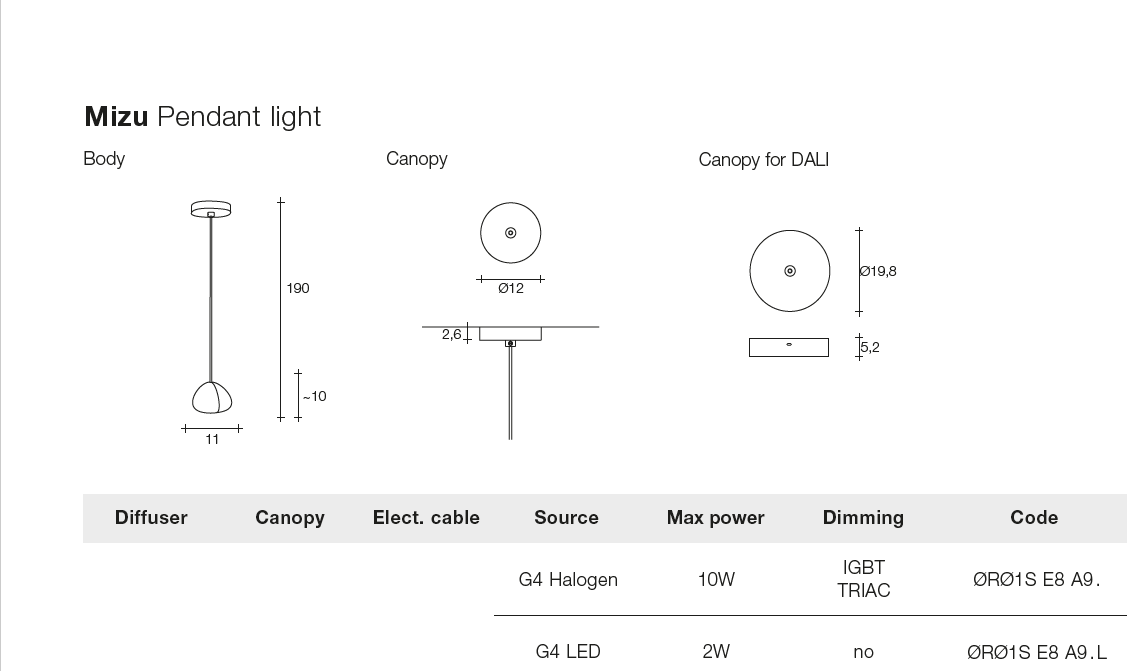 canopy size Ø 12 x H 2,6 cm (Ø 19,8 x H 5,2 cm for "g4 led or halogen | dali" option)