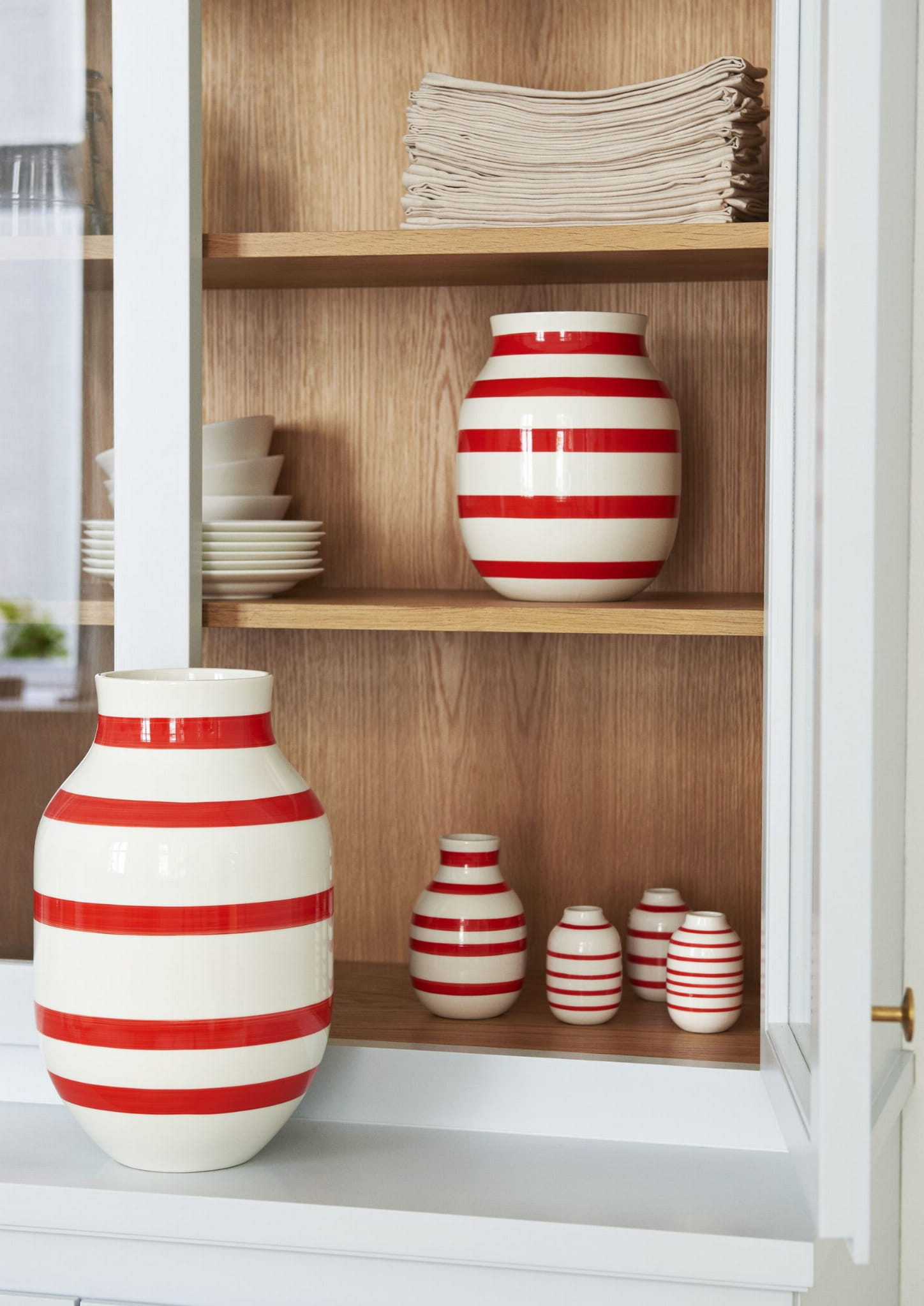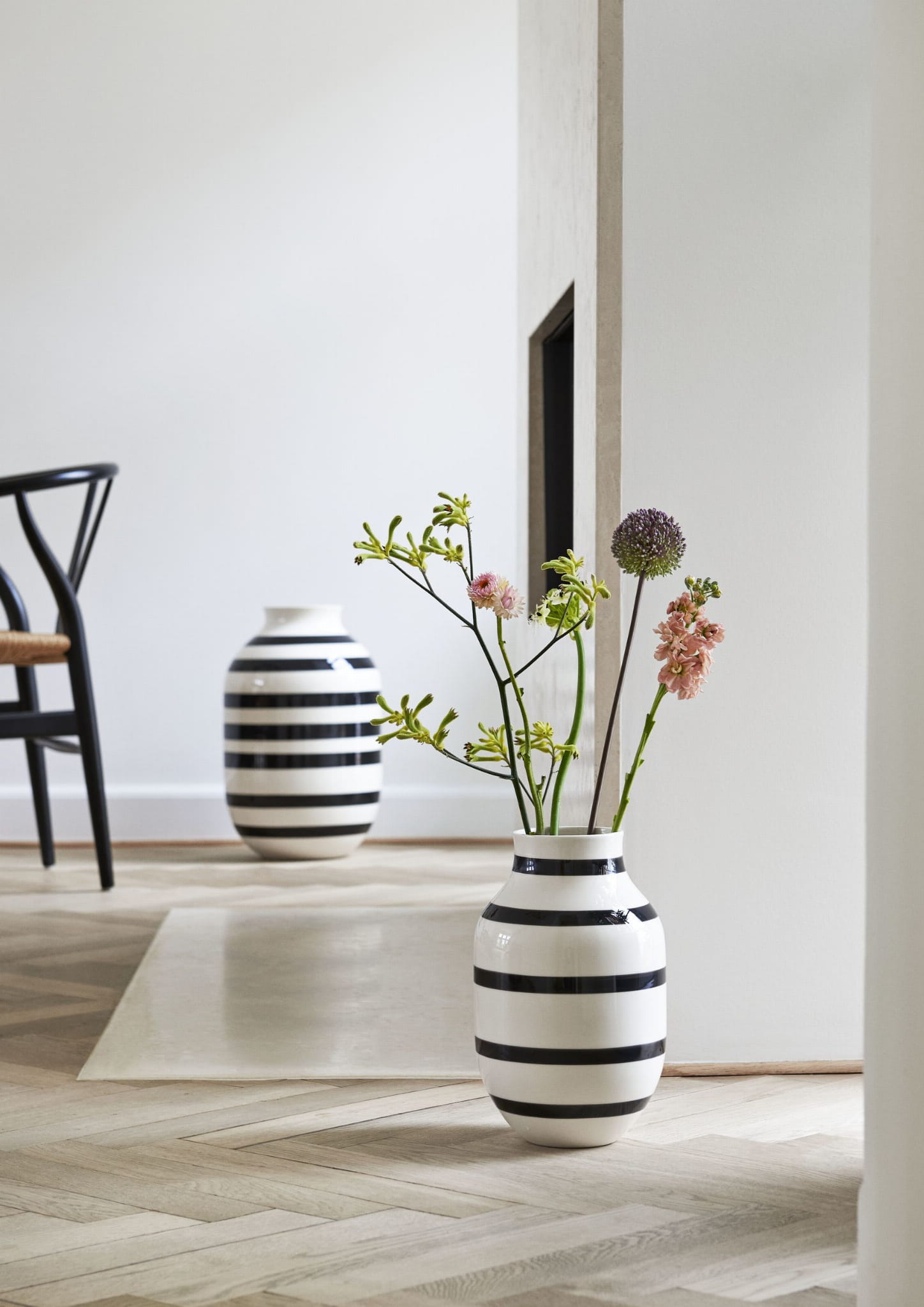 Wazon z serii Omaggio duńskiej marki Kähler to klasyka nowoczesnego designu. Wykonany z wysokiej jakości ceramiki, przyciąga uwagę szerokimi, ręcznie malowanymi pasami, które nadają mu unikalny charakter. Jego lśniąca powierzchnia subtelnie odbija światło, podkreślając kształt i kolor dekoracji umieszczonych wewnątrz.