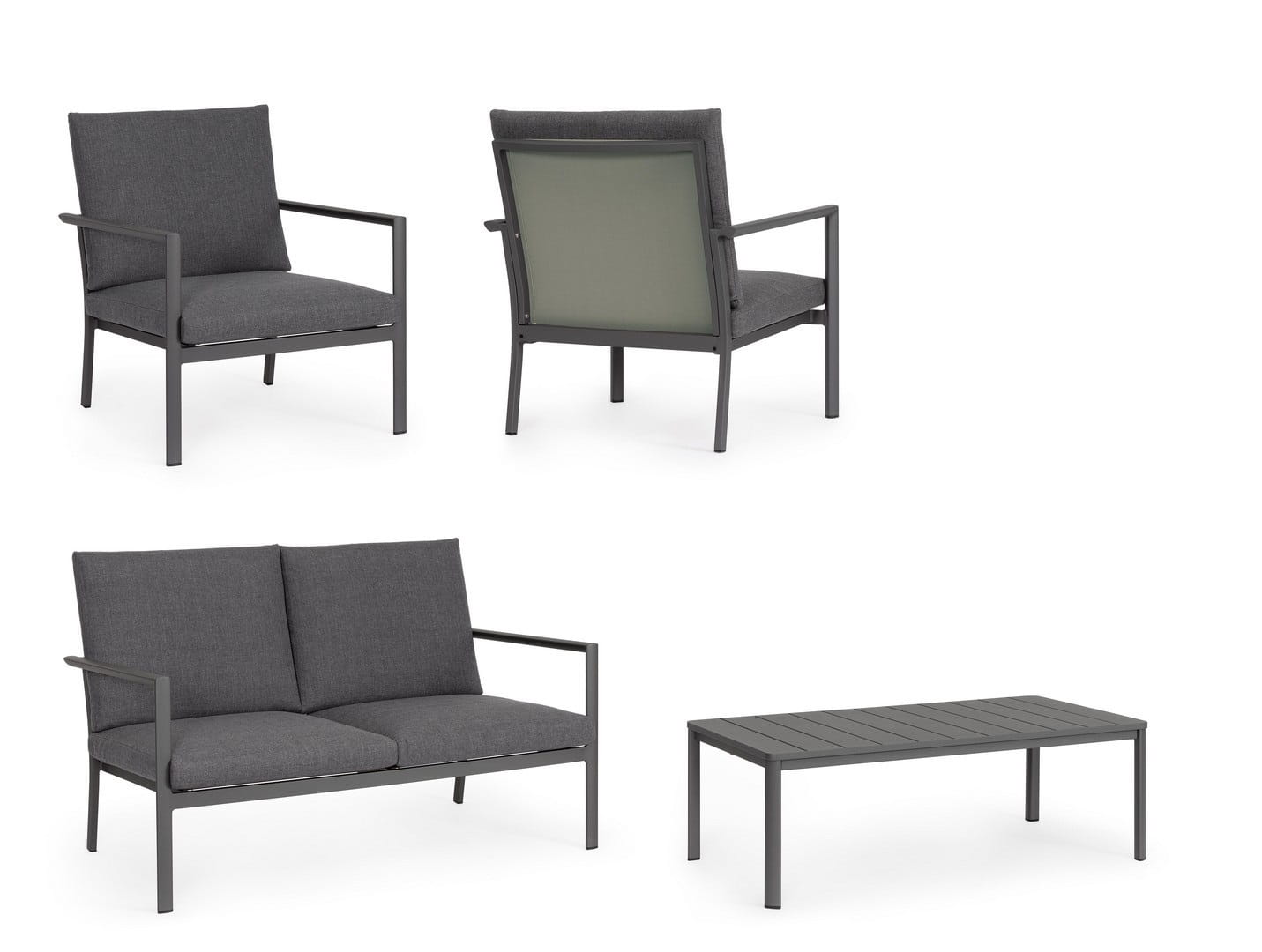 Stolik i krzesła z ramą aluminiową, pokrytą proszkową powłoką (poliestr). Siedzisko i oparcie wykonane z tekstylenu 1x1. Poduszki z materiału Olefin (100% polipropylen), odpornym na wodę, łatwe do zdjęcia. Śruby ze stali nierdzewnej. Oparcia i nogi stolika wymagają montażu.